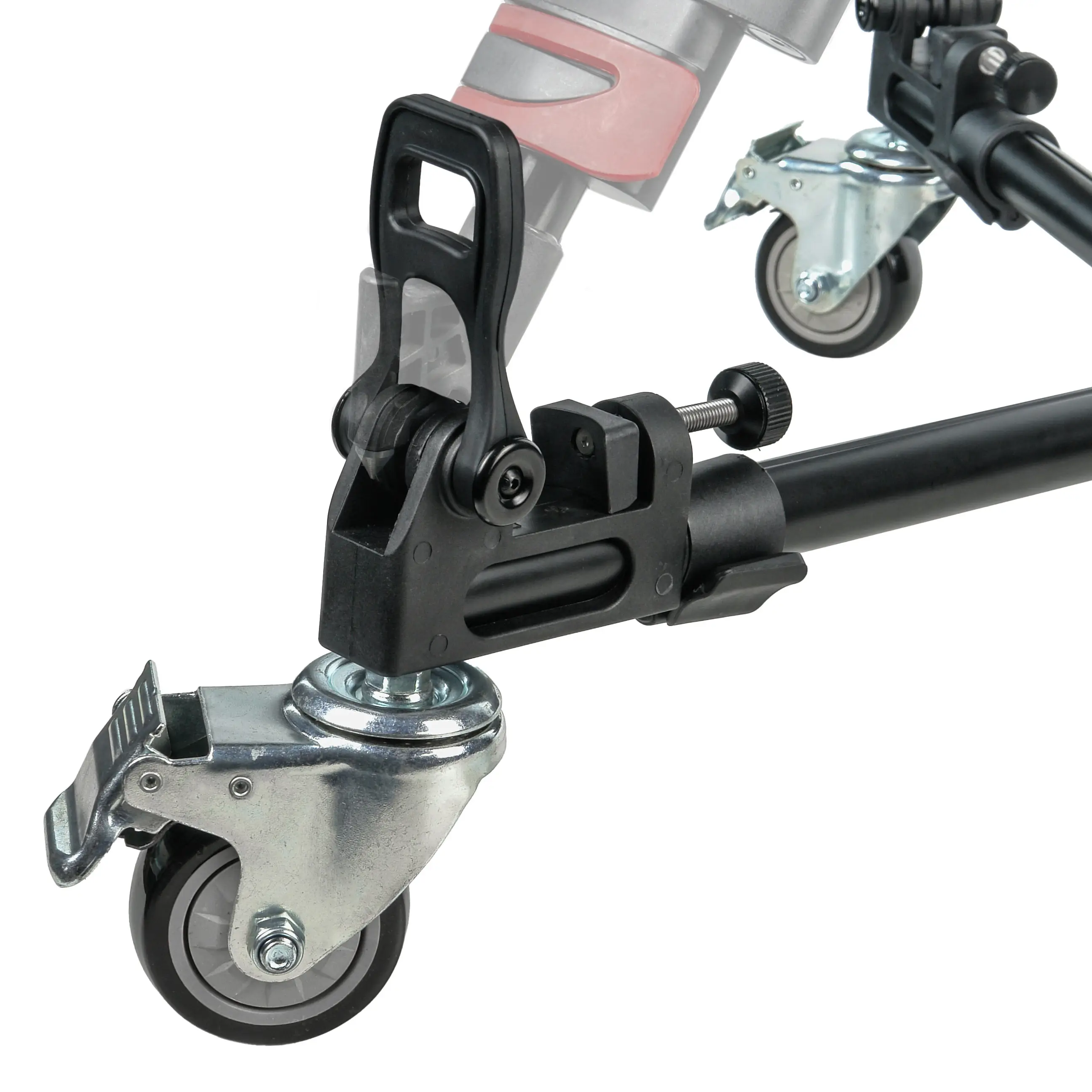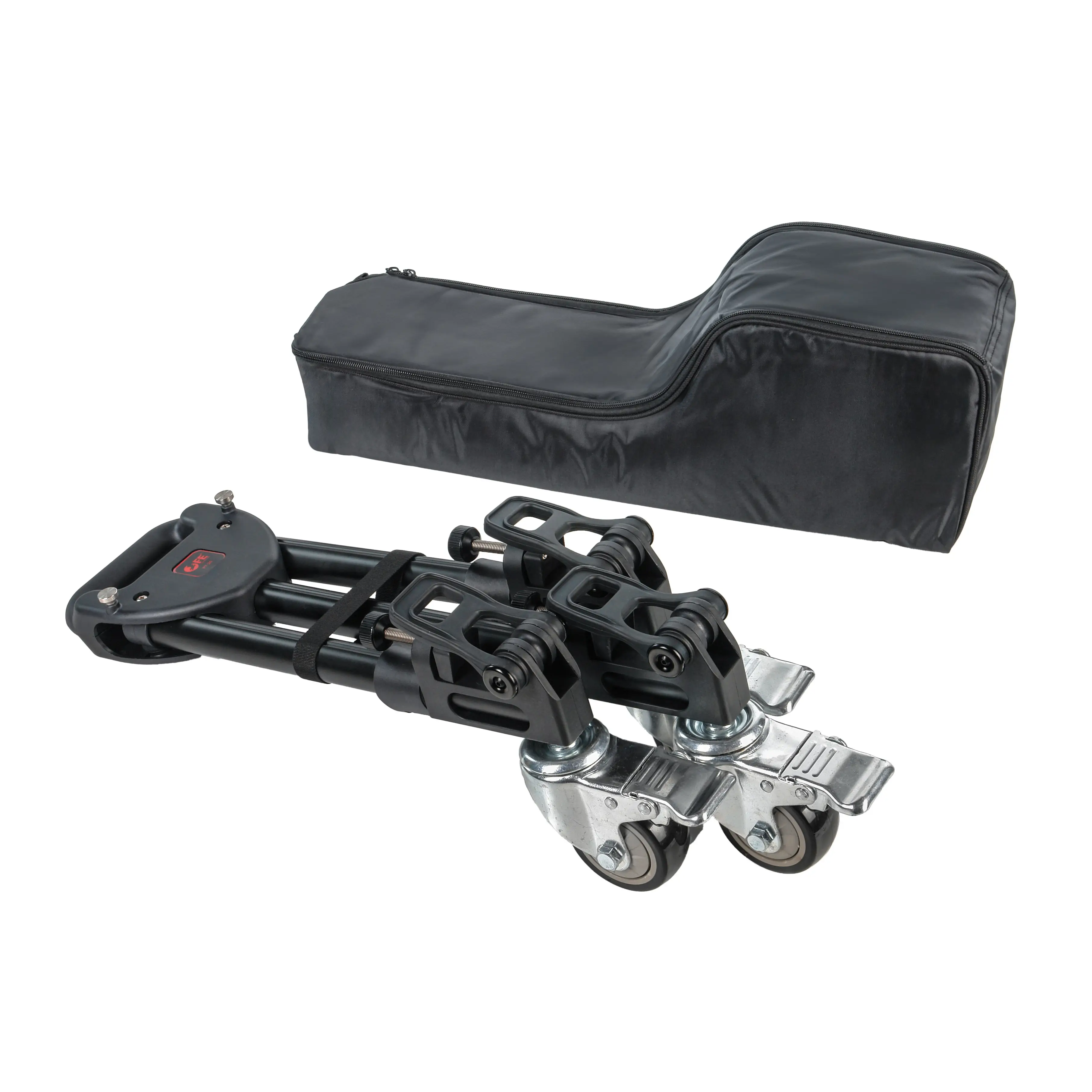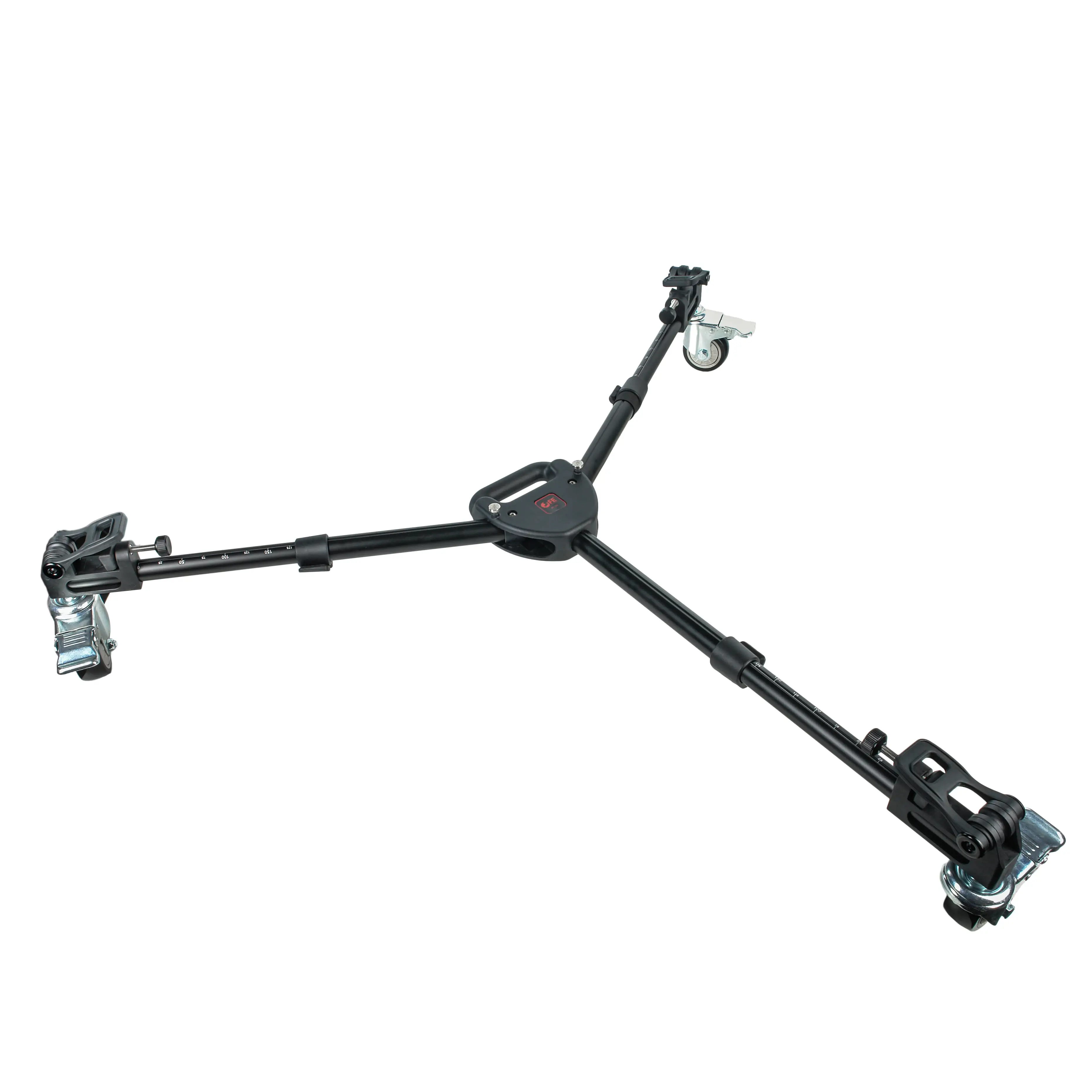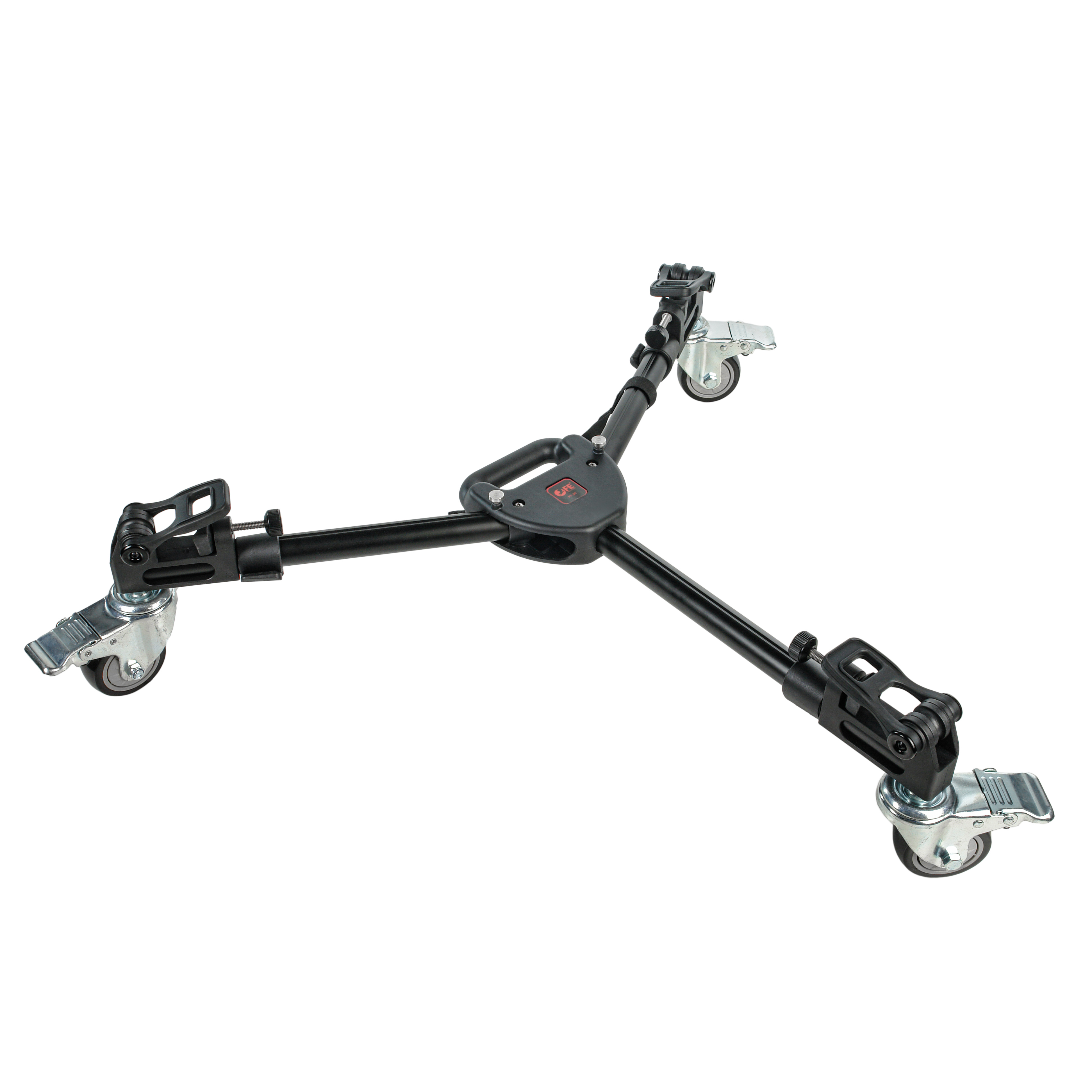 Три резиновых колеса диаметром 75 мм гарантируют плавный и бесшумный ход, что особенно важно при видеосъемке. Благодаря повороту колес на 360 градусов тележка обладает высокой маневренностью в ограниченном пространстве. На каждом колесе установлен индивидуальный тормоз для надежной фиксации во время работы.