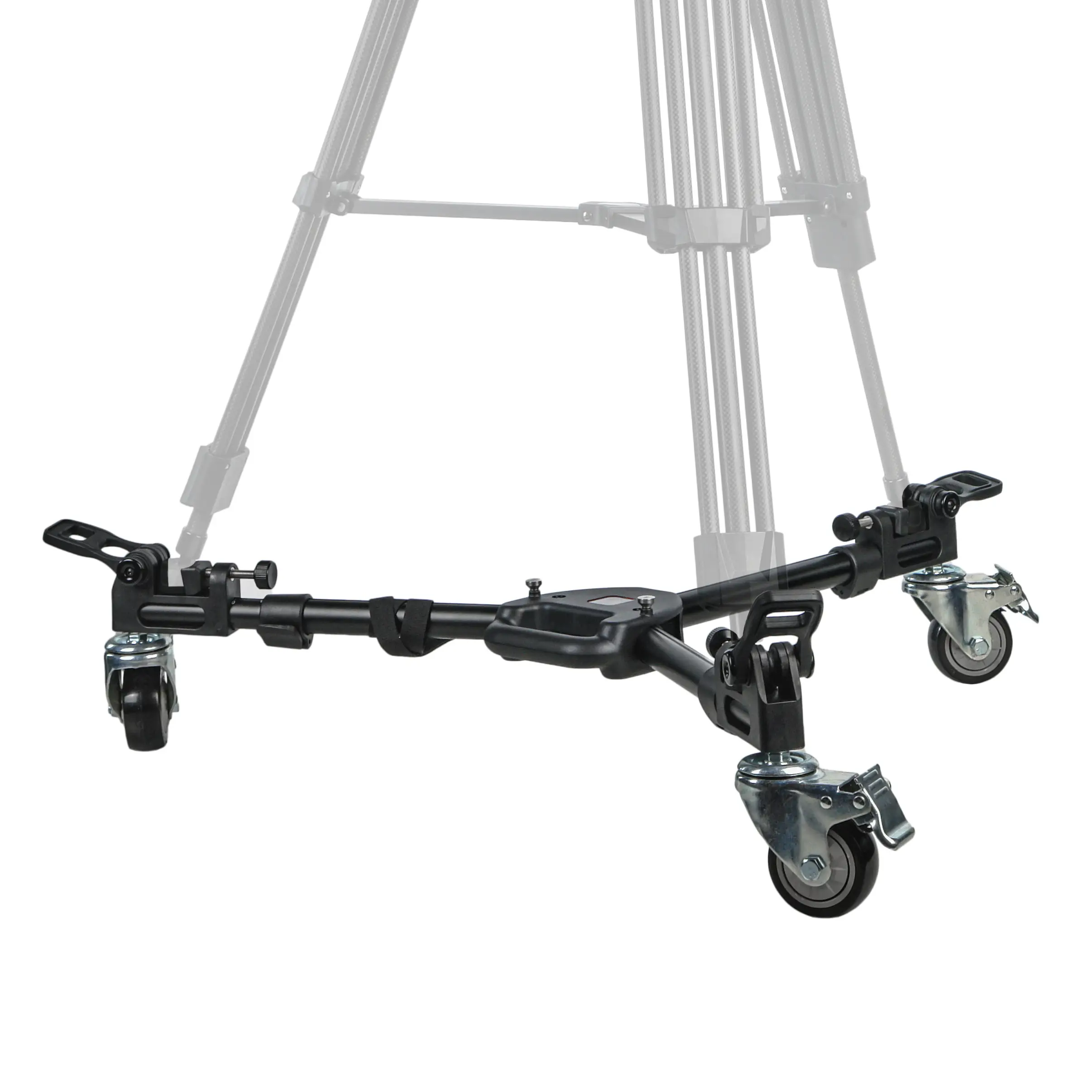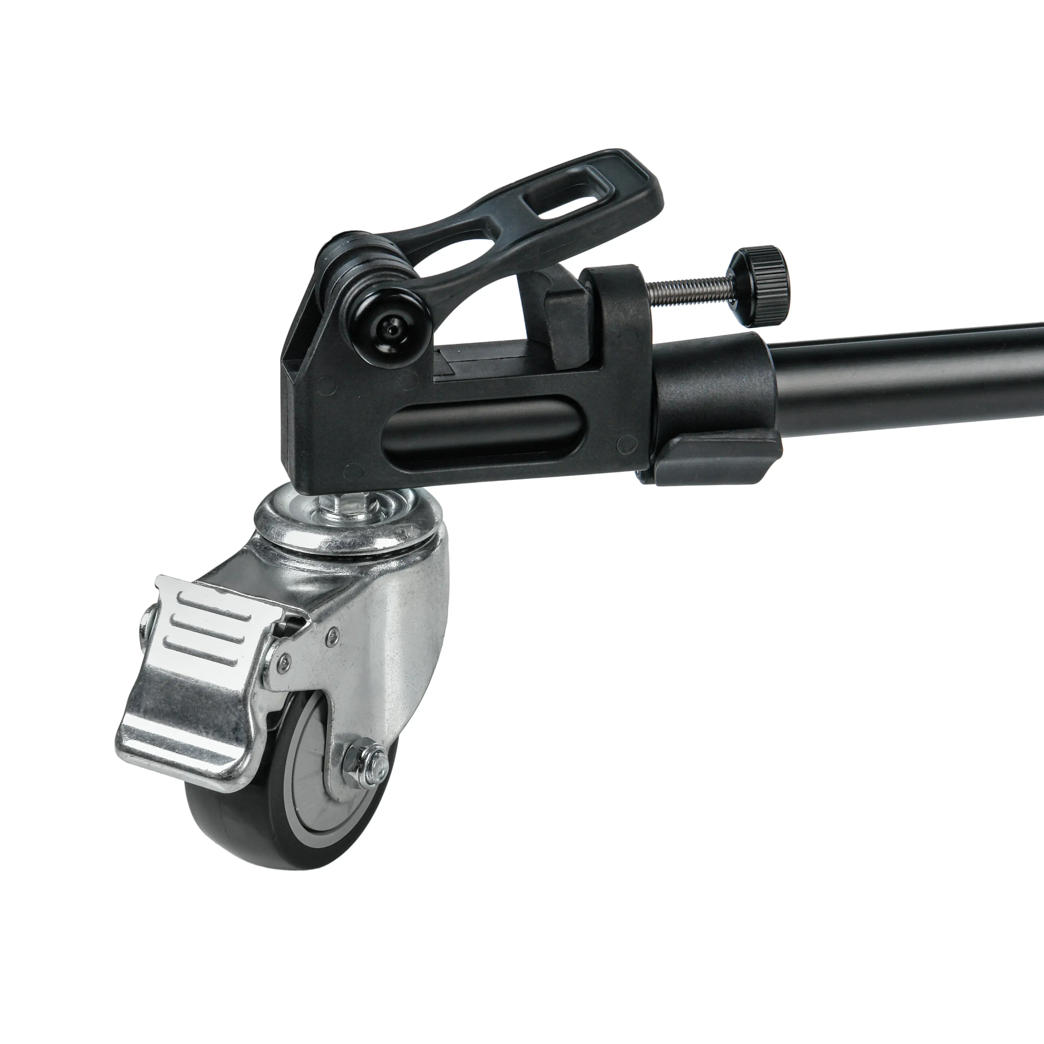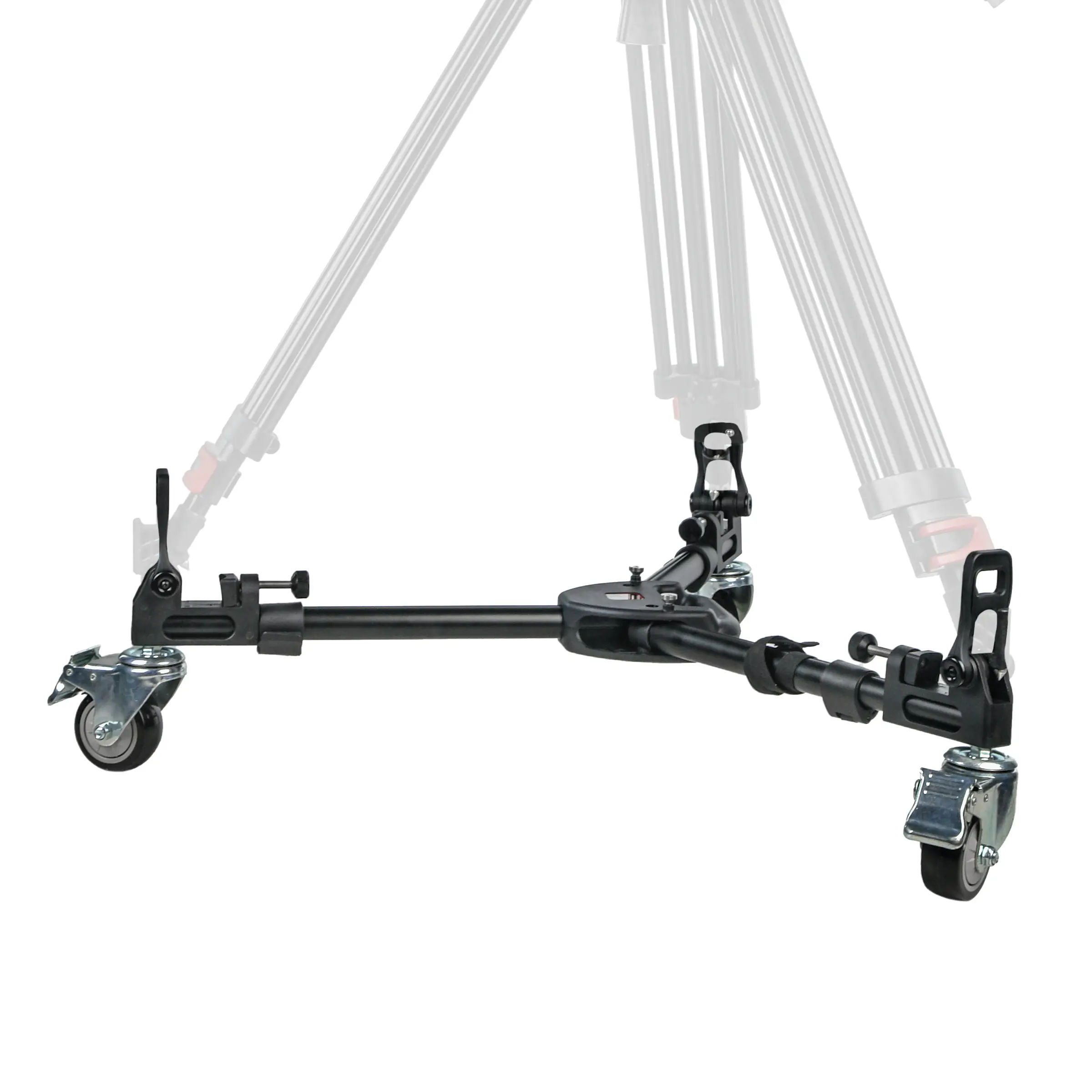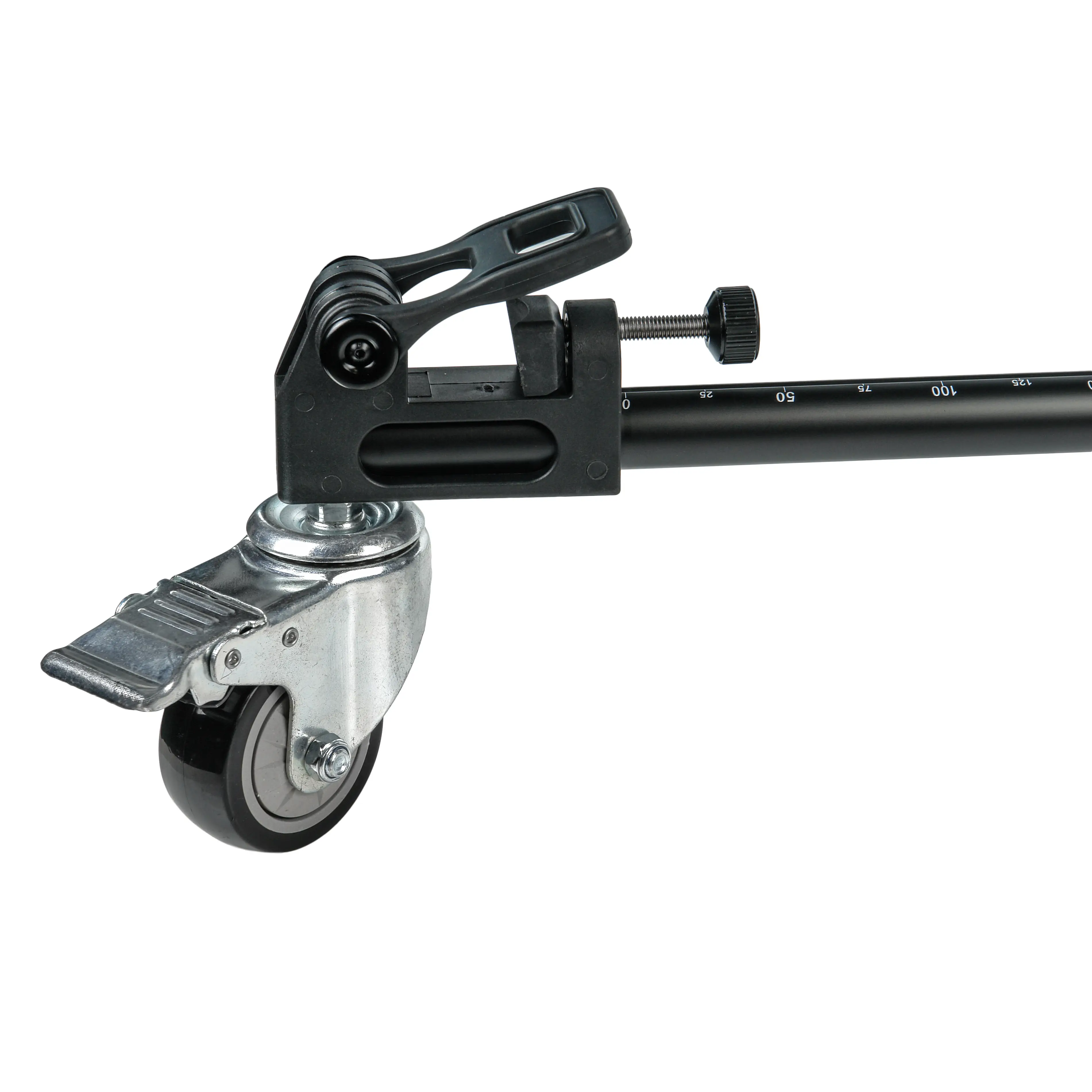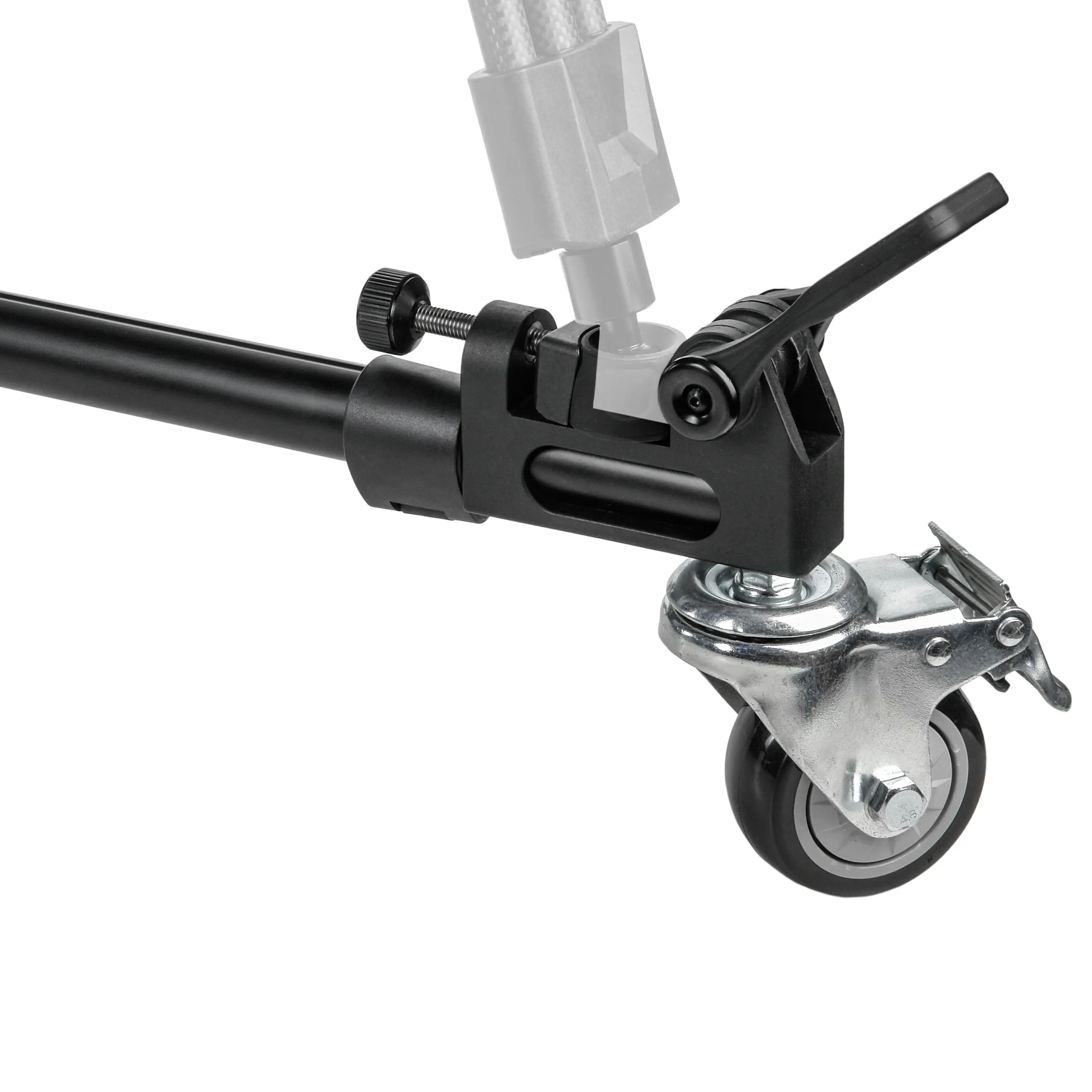 Три резиновых колеса диаметром 75 мм гарантируют плавный и бесшумный ход, что особенно важно при видеосъемке. Благодаря повороту колес на 360 градусов тележка обладает высокой маневренностью в ограниченном пространстве. На каждом колесе установлен индивидуальный тормоз для надежной фиксации во время работы.