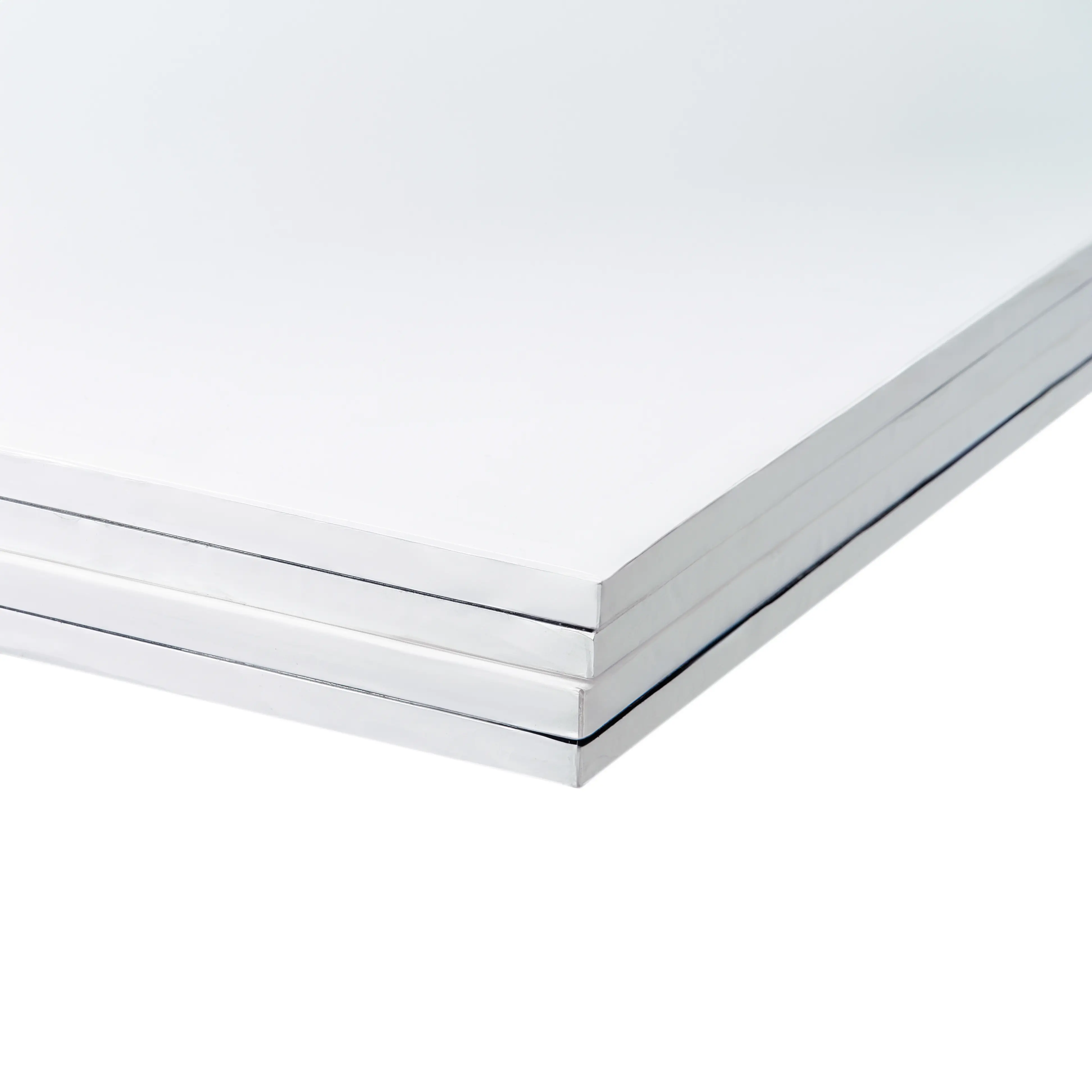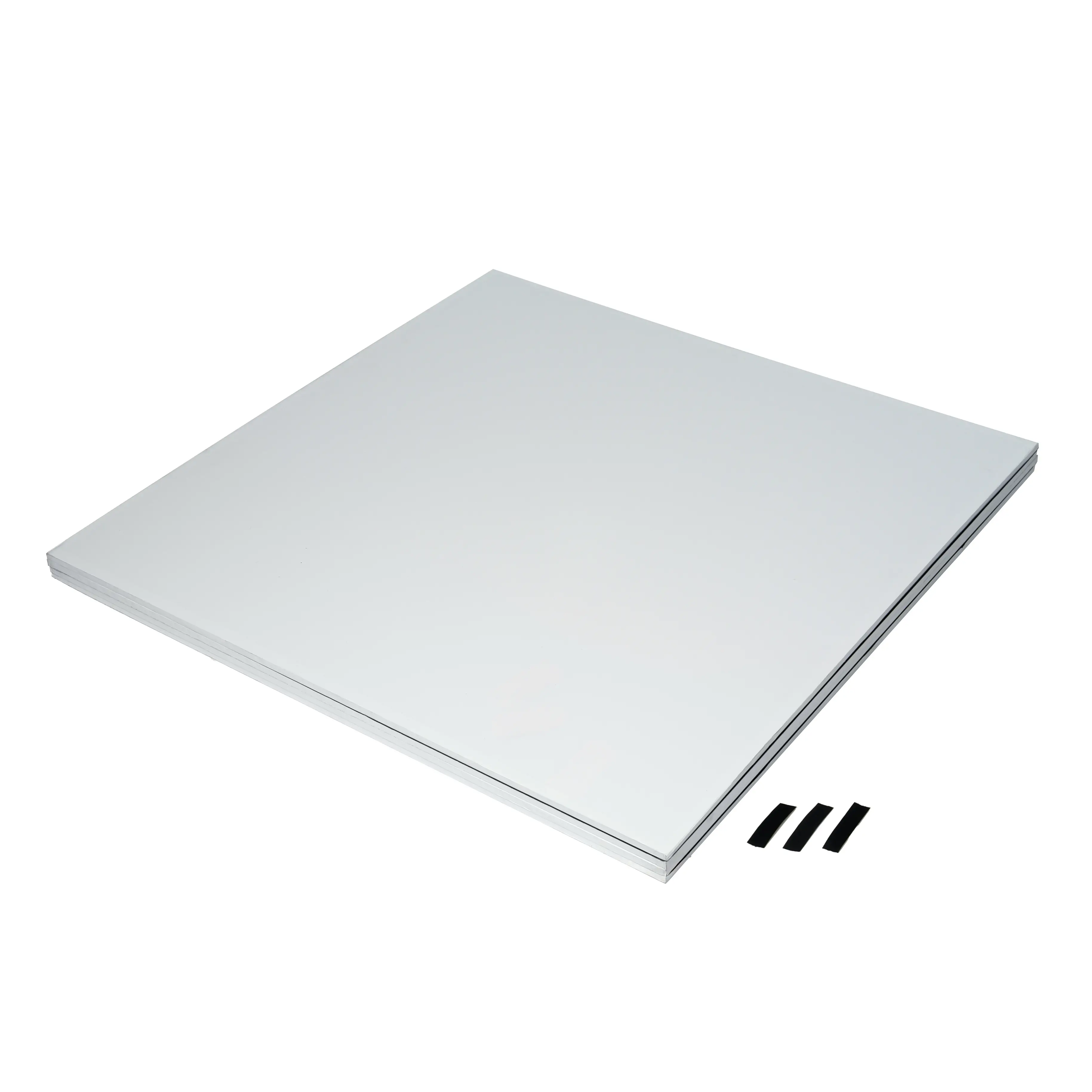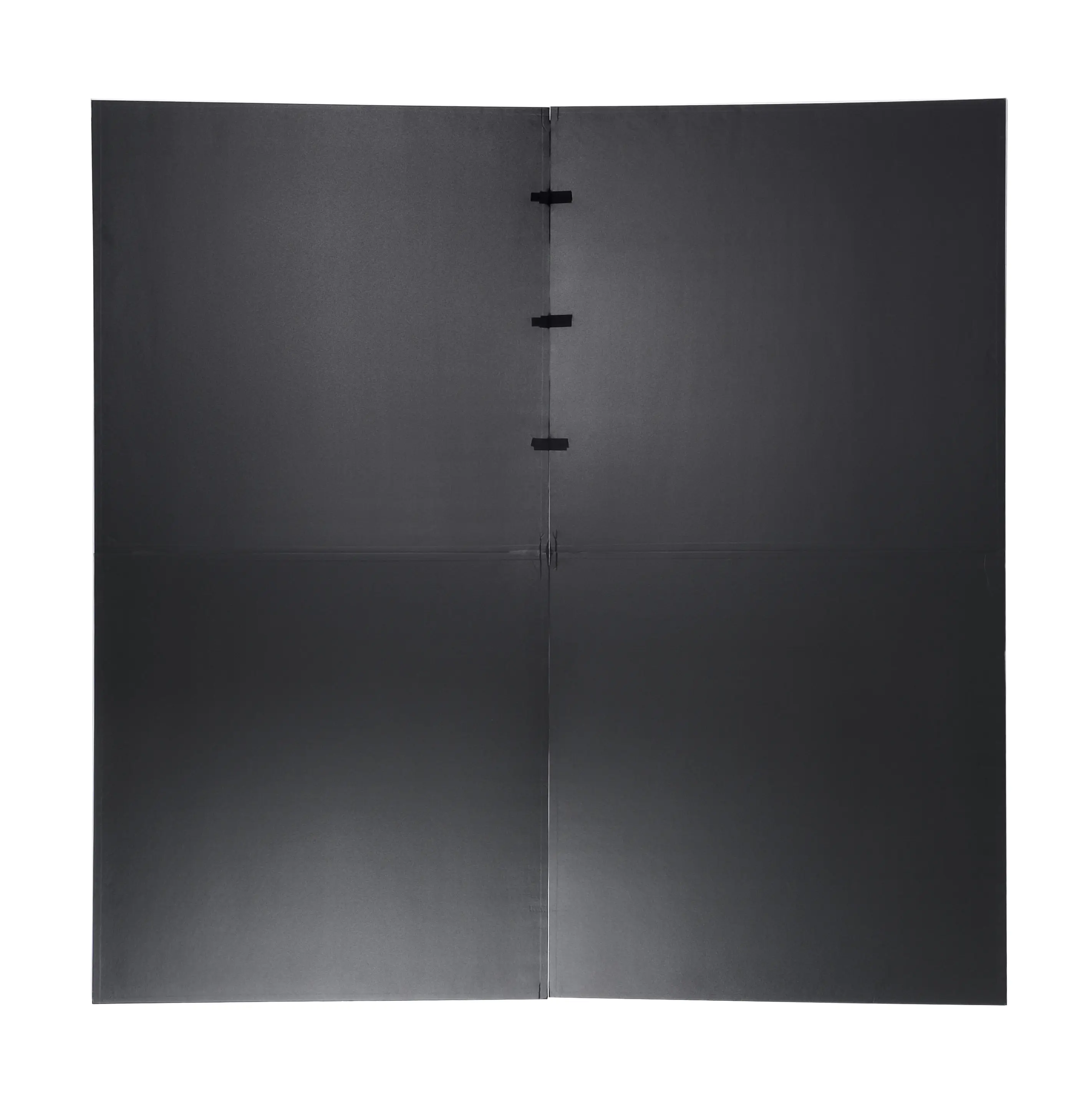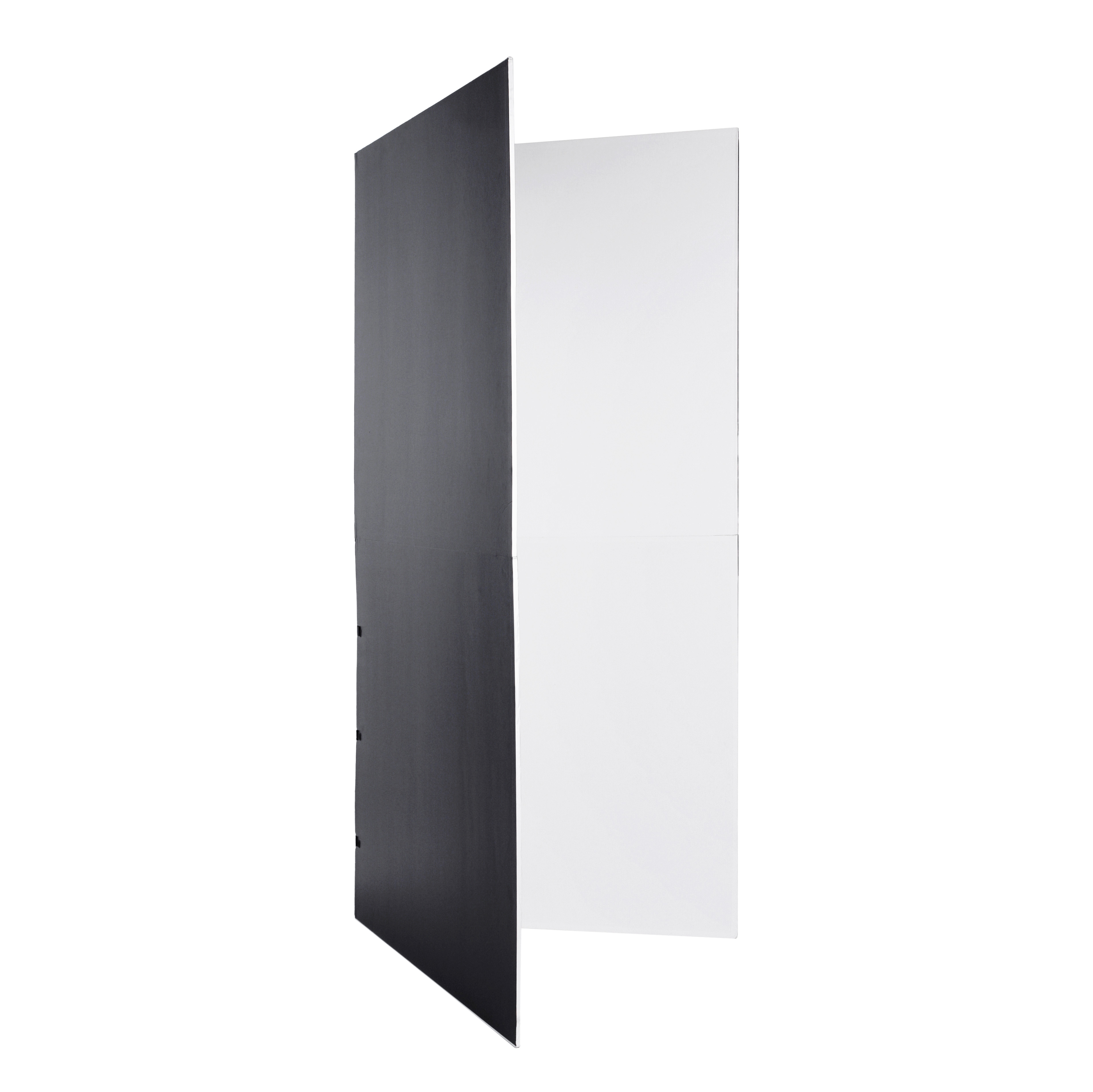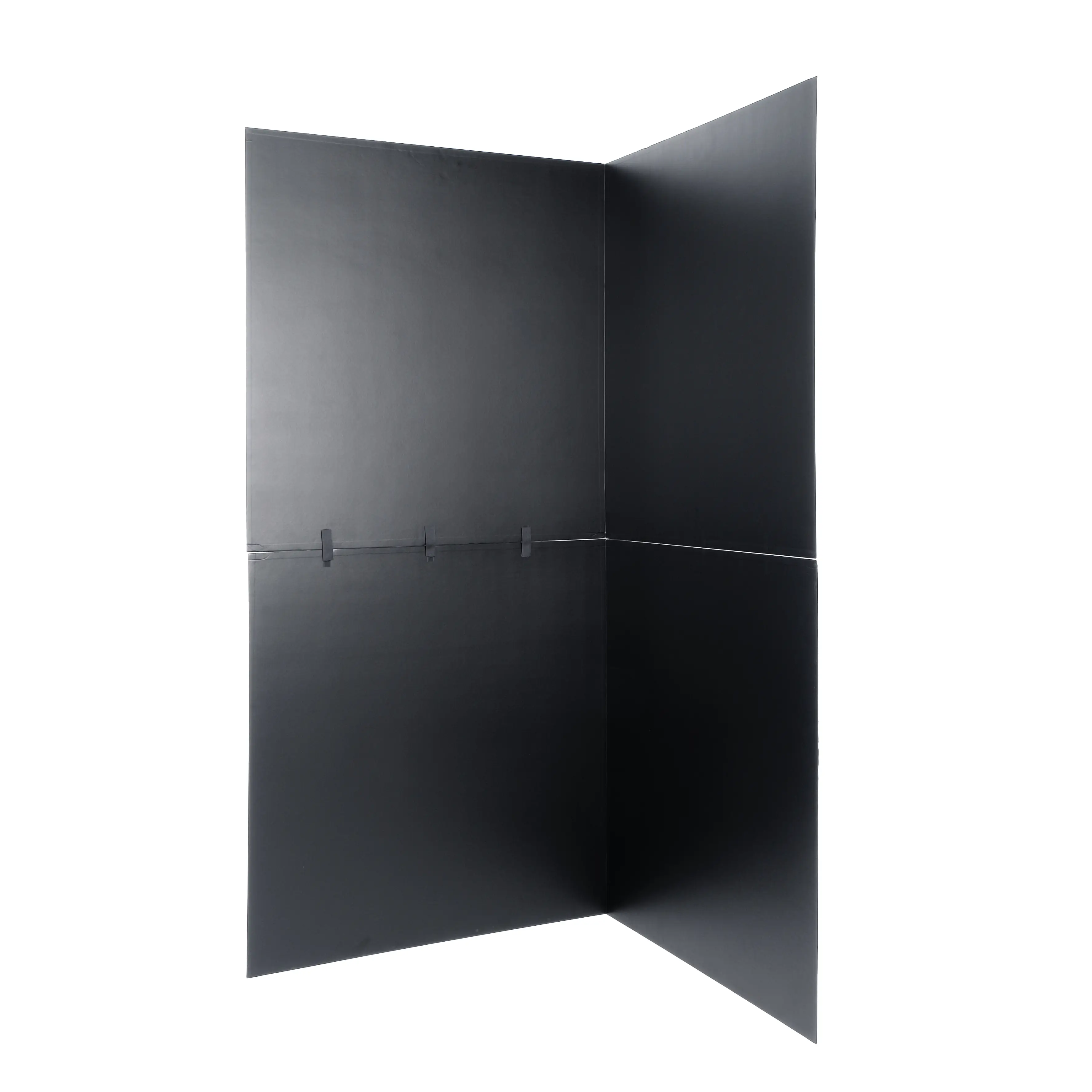 Основной материал — тонкий и легкий пенокартон ПВХ, который сочетает низкий вес с высокой жесткостью, предотвращая деформацию под собственным весом. Поверхности обработаны для оптимального светового взаимодействия: черная сторона поглощает свет, минимизируя блики, а белая — отражает и рассеивает его для равномерного освещения.