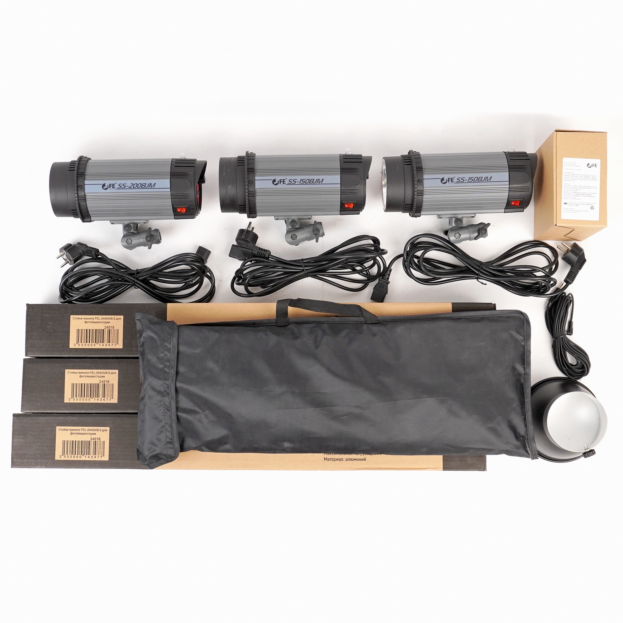 Повреждена упаковка. Нет сумки, ламп пилотного света, потёртости, царпины на вспышках и стойках.