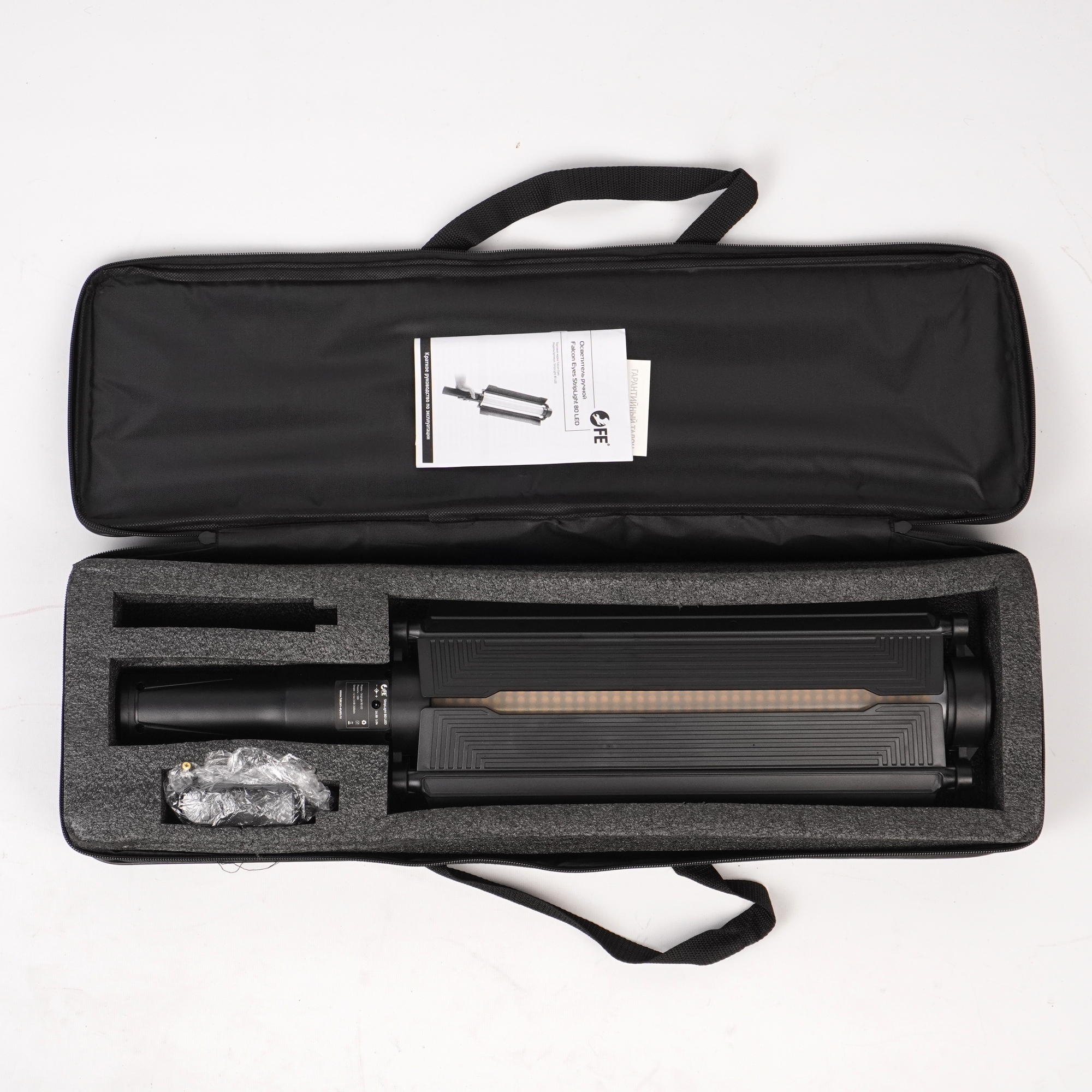 504 светодиода (252 холодного белого и 252 теплого белого света), мощность 18 Вт, плавная регулировка яркости от 10 до 100%, цветовая температура 3200/5600К, индекс цветопередачи CRI≥97, встроенная литиевая батарея, питание от сети. Пульт ДУ, сумка-чехол в комплекте.