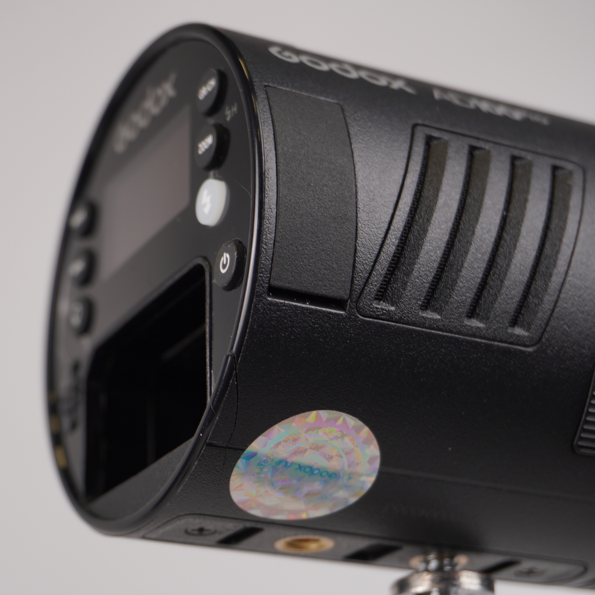 В нижней части корпуса вспышки расположены два закладные гайки с резьбой 1/4'', при помощи которых устройство устанавливается на комплектный кронштейн AD-E2 или напрямую на осветительную стойку. Адаптер AD-E2 позволяет отрегулировать угол наклона вспышки, установить с фотозонт или использовать его как рукоятку, для удерживании в руке.