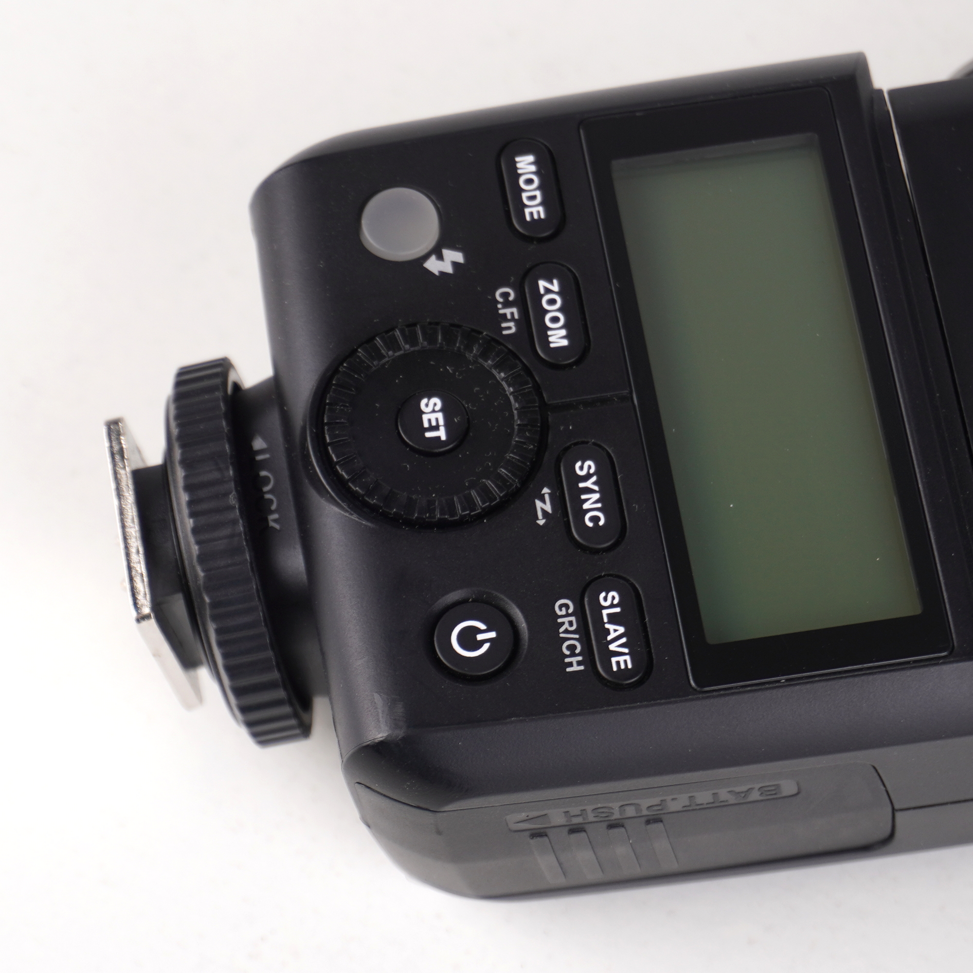 На панели управления находятся кнопка вкл/выкл вспышки, кнопка Test (красная подсветка - индикатор готовности), четыре кнопки управления функциями и кнопка-колесо для регулировки настроек. В батарейном отсеке расположен micro-USB порт для обновления прошивки. Все параметры отображаются на ЖК-дисплее с контрастной подсветкой.