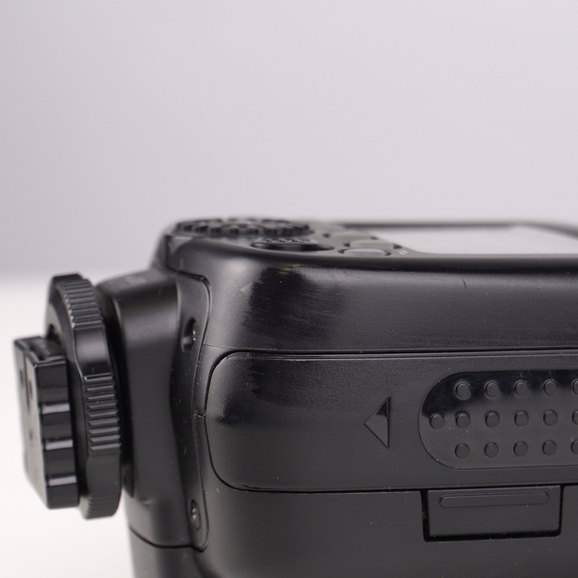 На панели управления расположен большой ЖК-дисплей с двухцветной подсветкой (зеленый-master/красный-slave). Текущая функция верхнего ряда кнопок отображается соответственно над ними на дисплее. Кнопка вкл/выкл вспышки выполнена в виде ползунка, а настройка параметров осуществляется удобным колесиком.