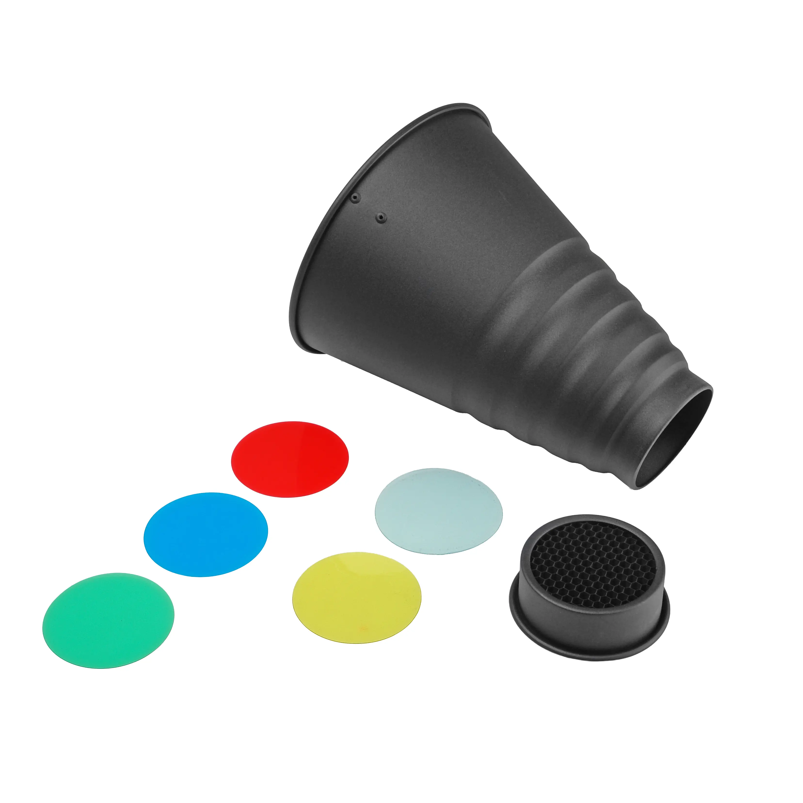 В комплекте поставляется сотовая решетка, которая сужает световой пучок еще больше, а также четыре цветных гелевых фильтра (красный, синий, зеленый, желтый и рассеивающий), которые позволяют быстро менять цвет освещения. Соты и цветные фильтры устанавливаются на конус с помощью съемного держателя.