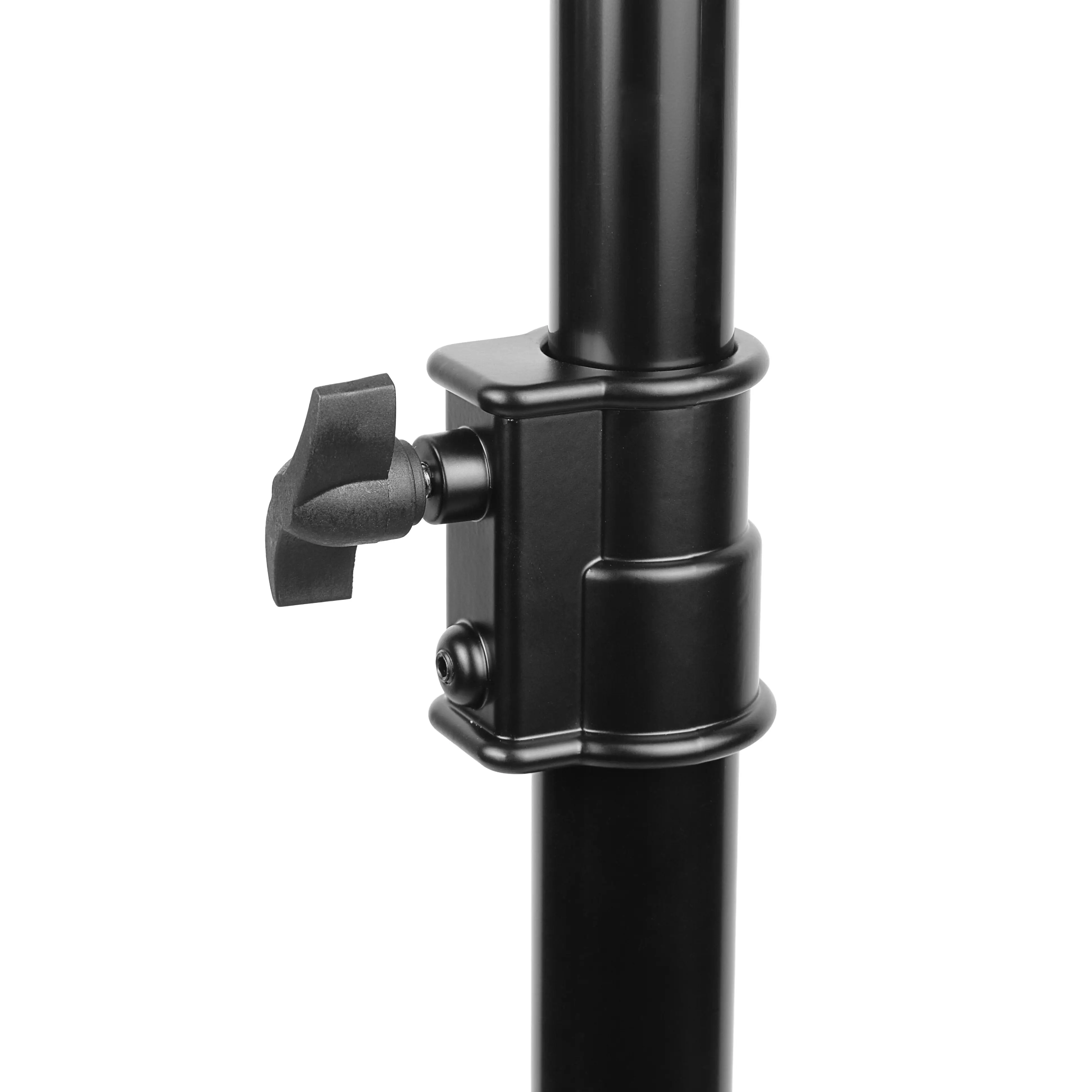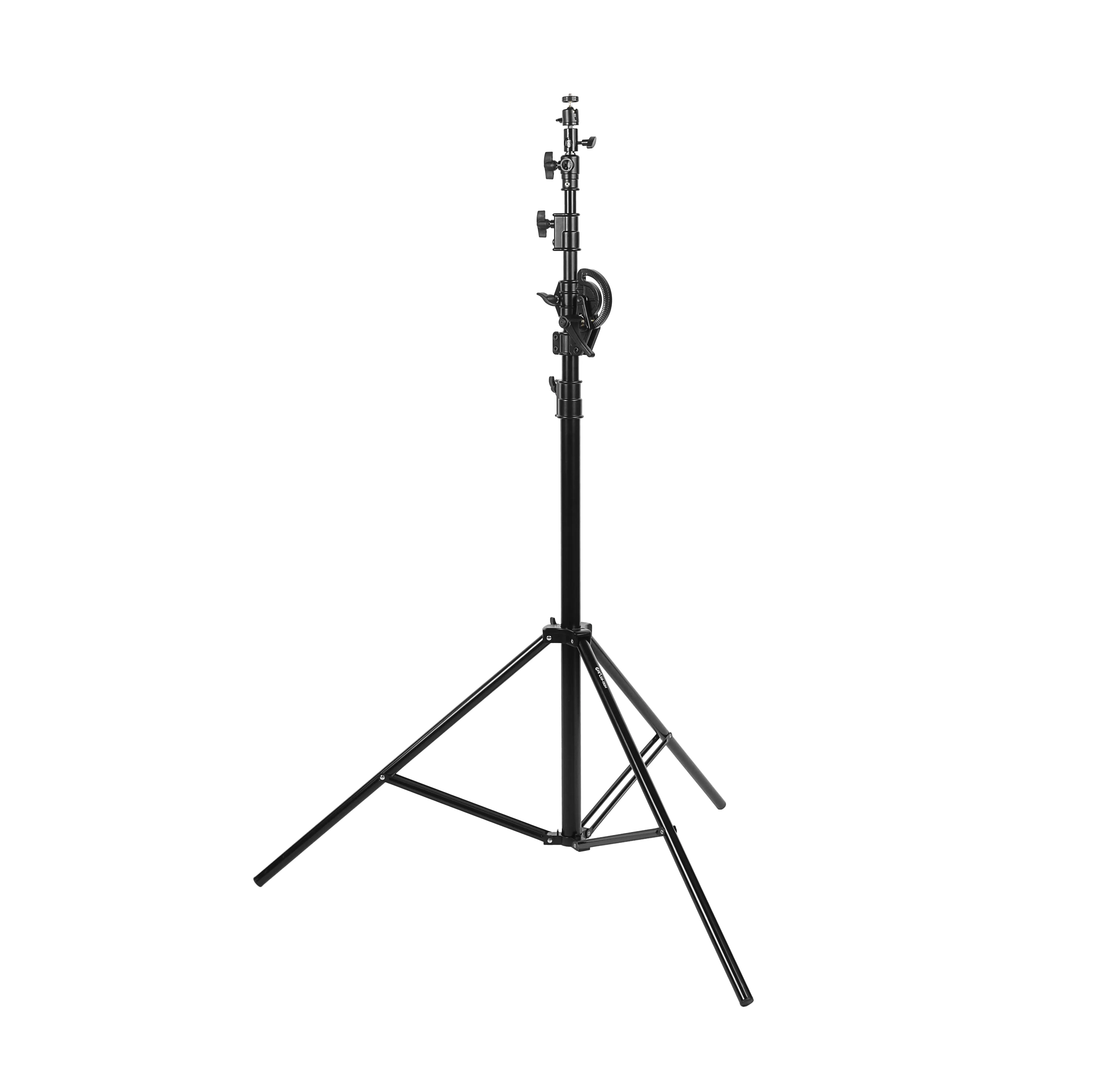 Двухсекционная стальная телескопическая стойка обеспечивает рабочую высоту до 190 см. Секции оснащены пружинной амортизацией, которая обеспечивает плавное и безопасное опускание оборудования при ослаблении винтовых зажимов. Широкое основание с размахом 120 см гарантирует устойчивость конструкции. Для работы в сложных условиях при максимальном вылете стрелы или на ветру можно дополнительно усилить основание стойки дополнительным грузом, например, заполненным .