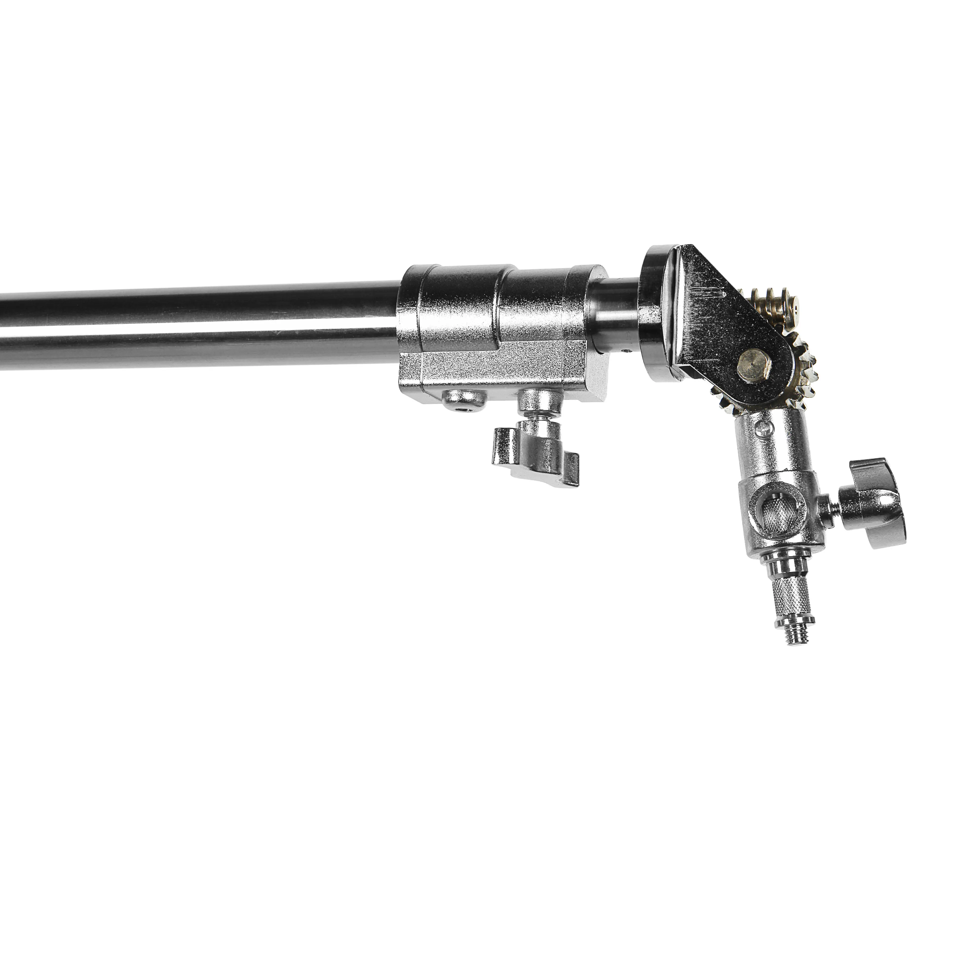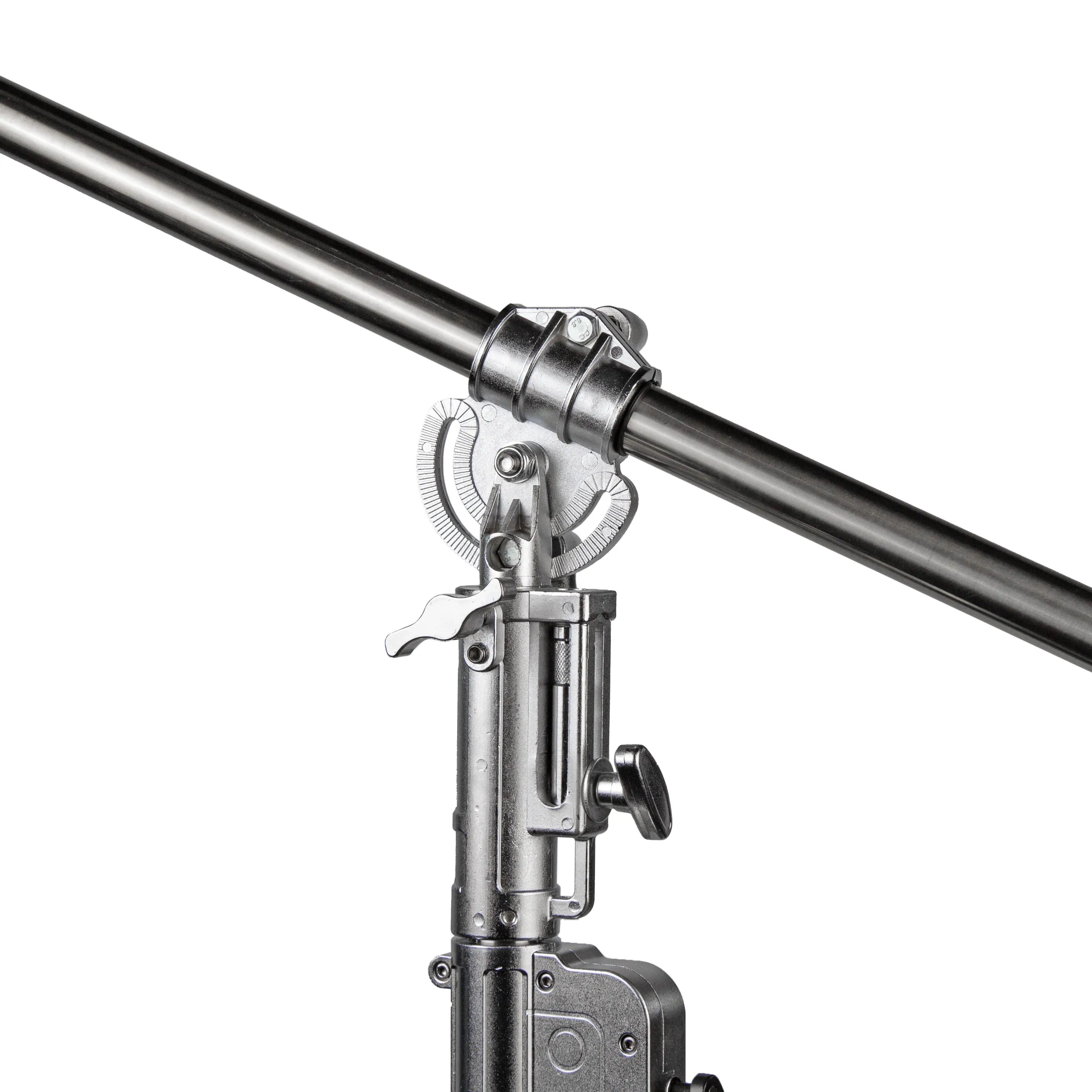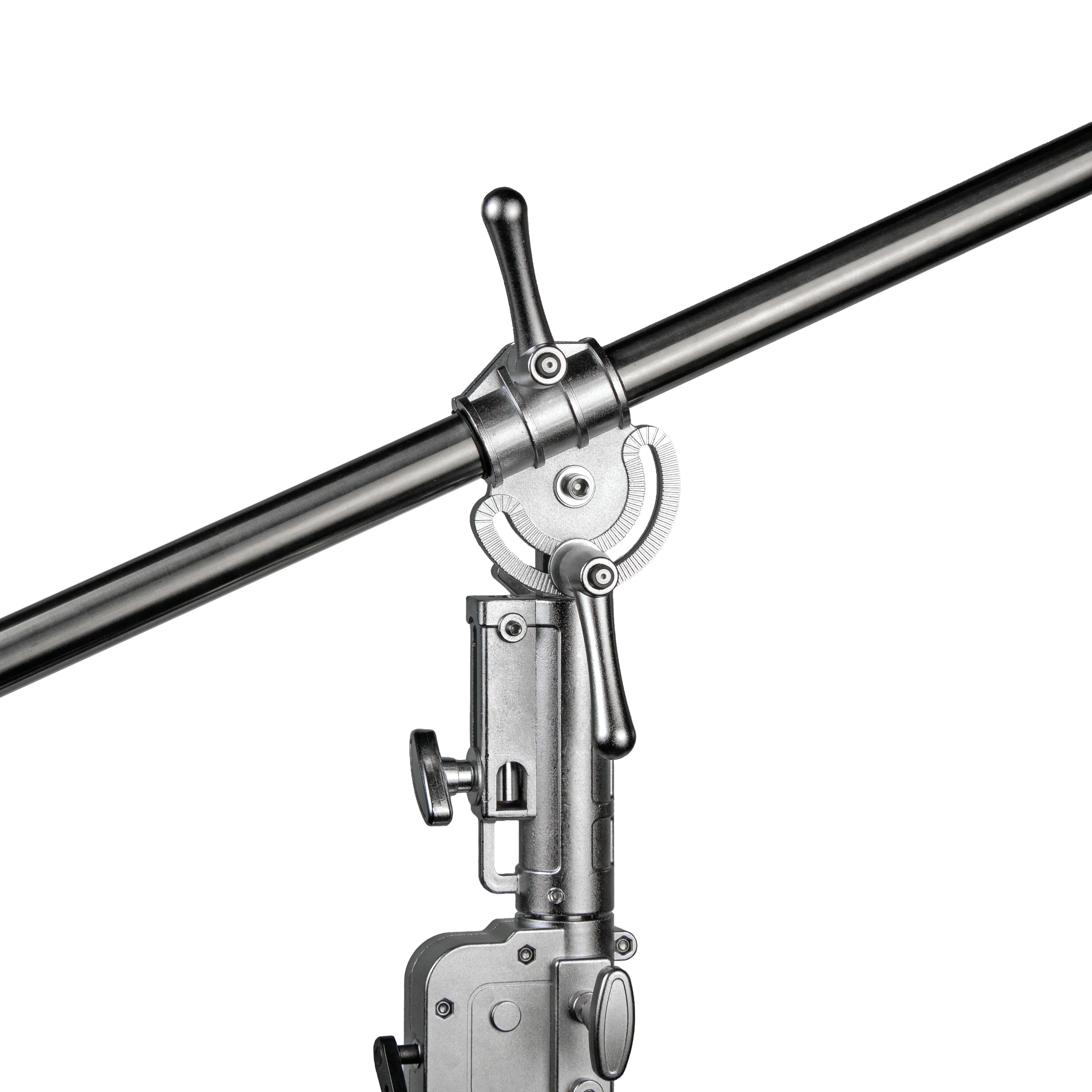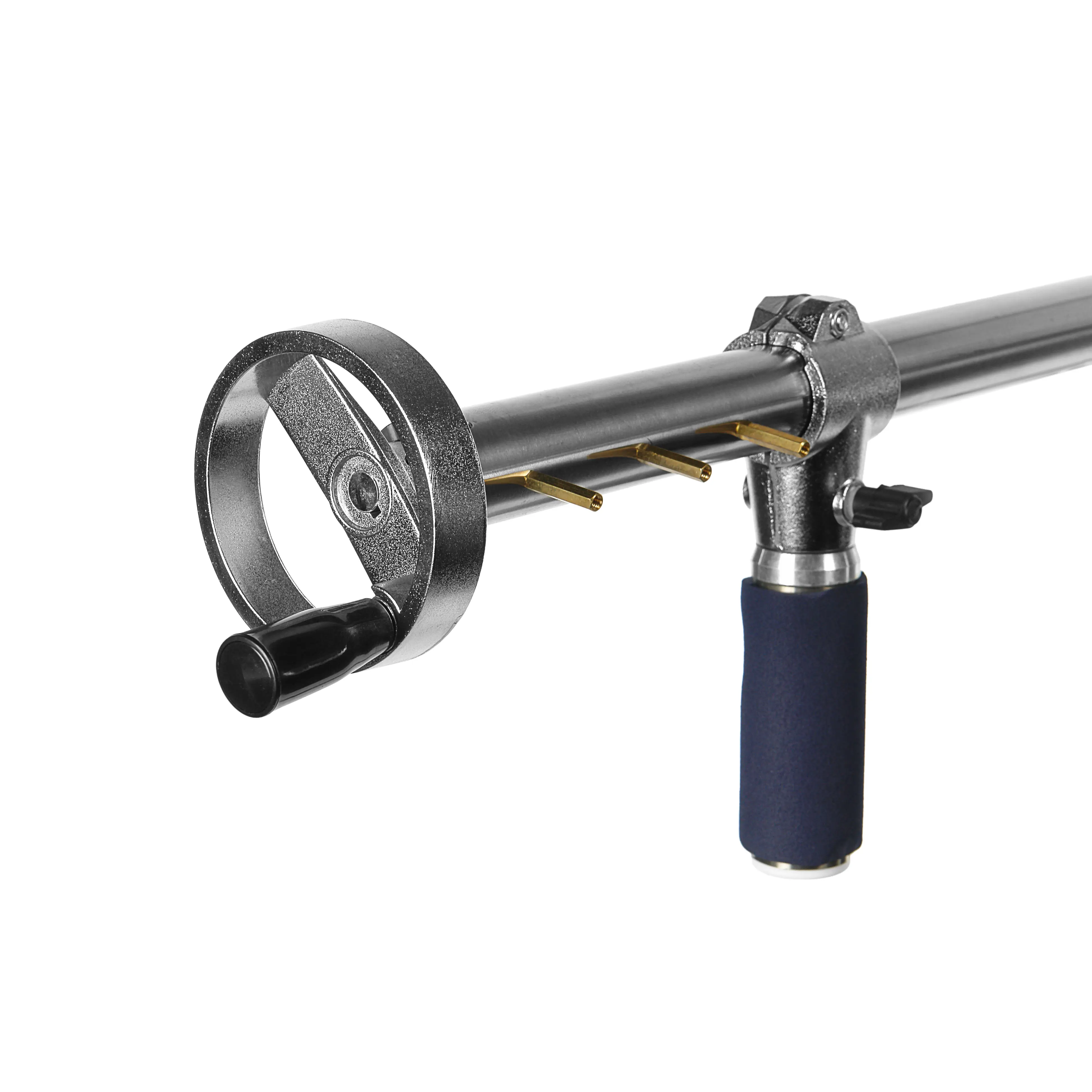 Перекладина состоит из двух секций диаметром 35/30 мм, ее длина регулируется от 130 до 240 см. На одном конце расположен съемный поворотный адаптер с червячным механизмом, на другом — маховик для точной регулировки положения адаптера. Вся конструкция журавля крепится на соединительной муфте, с помощью которой можно менять угол крана. Для удобства управления предусмотрена крупная рукоятка с покрытием из вспененного материала. Положение рукоятки регулируется и фиксируется винтовым зажимом.