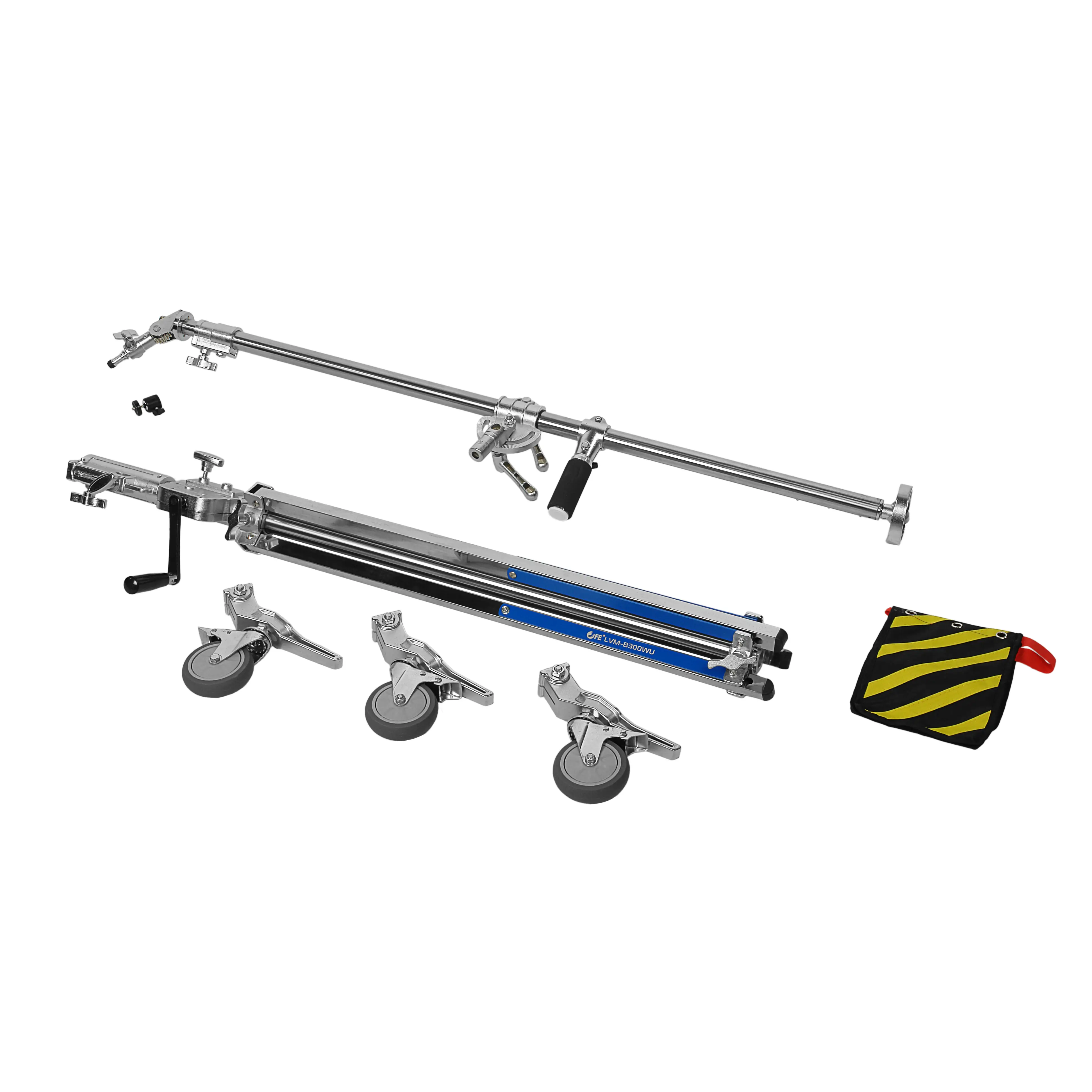 Falcon Eyes LVM-B300WU – прочный журавль с шаровой головкой для цифровых фото- и видеокамер, установленный на стойку-треногу с колесами. Конструкция позволяет разместить камеру непосредственно над объектом съемки, выводя саму стойку за пределы кадра. Металлическая сборка, большой диаметр секций и редукторный механизм подъема центральной колонны обеспечивают надежную и безопасную работу с оборудованием.