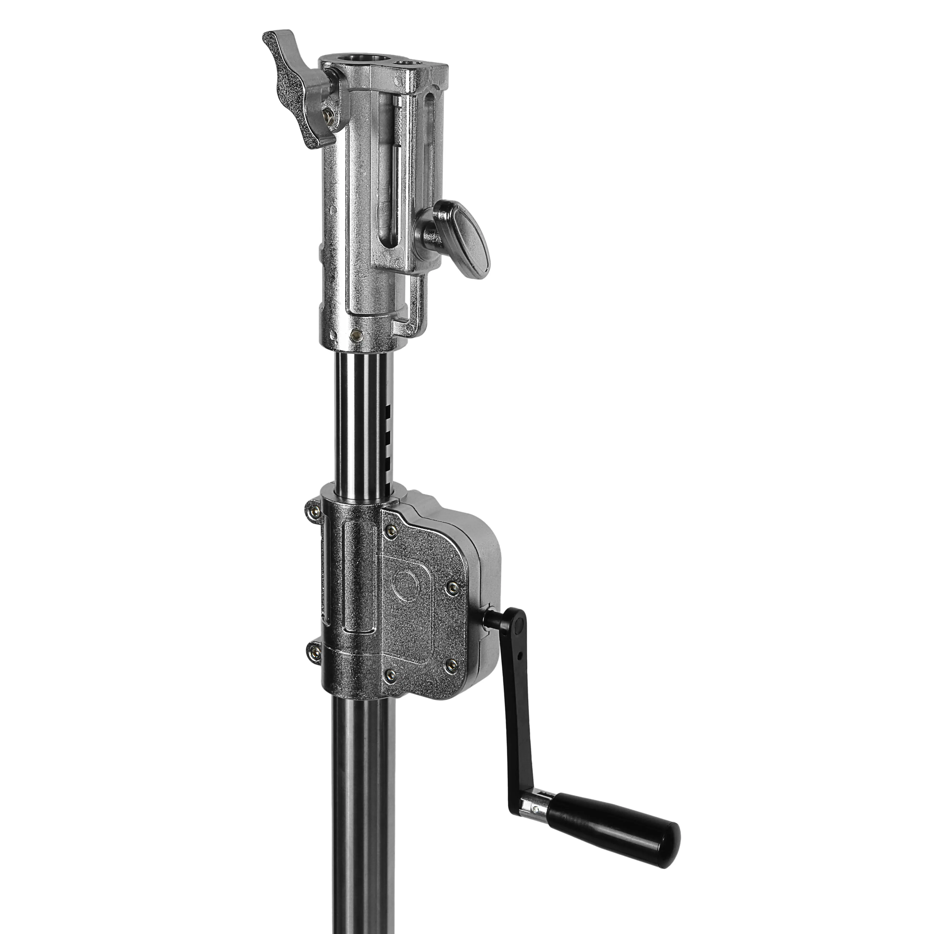 Ключевая особенность — редукторный механизм подъема колонны. Он снижает физическое усилие оператора, делая подъем оборудования легким и плавным. Дополнительный фиксатор в зоне растяжки нижней секции предназначен для тонкой регулировки высоты колонны.
