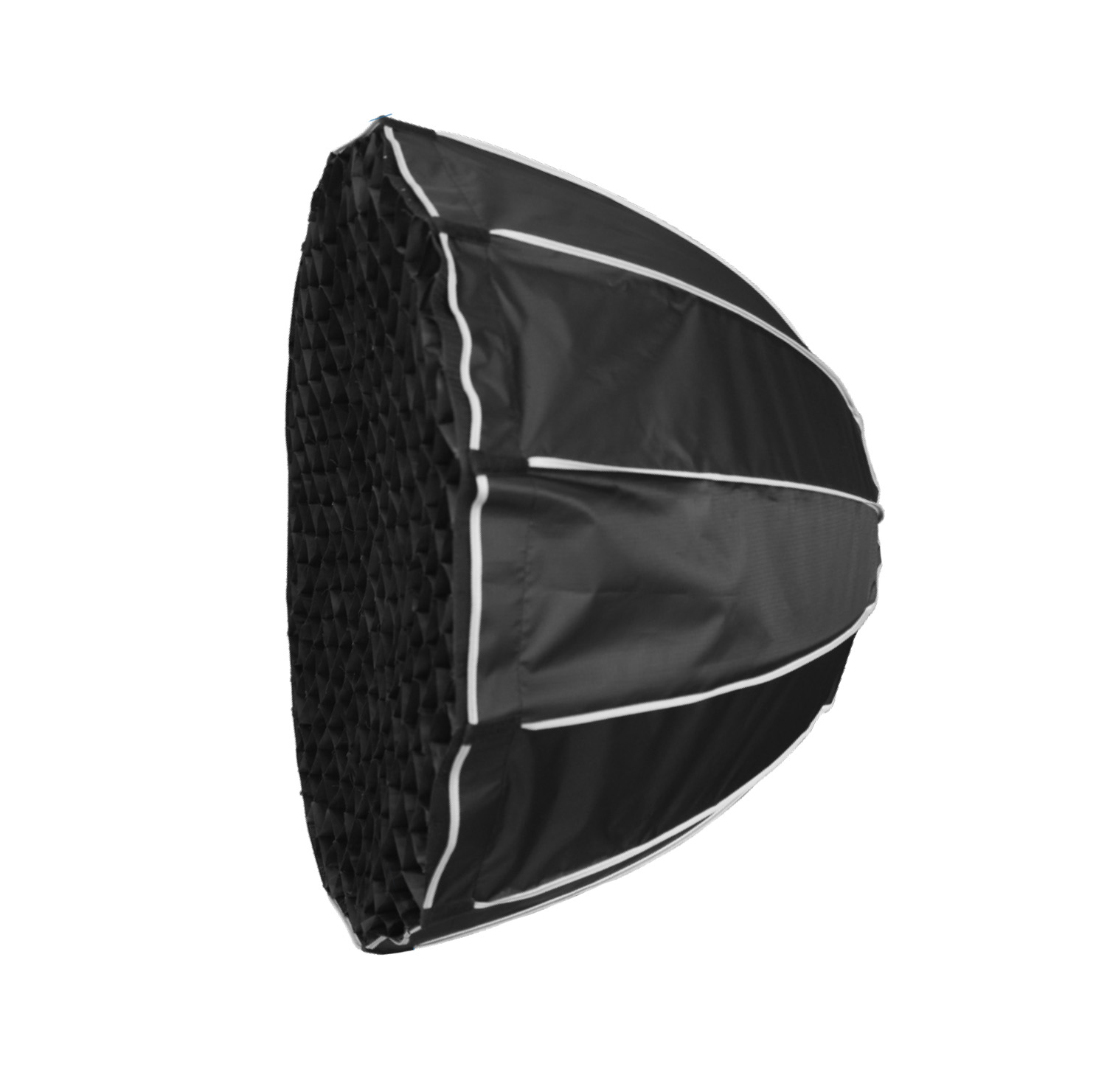 Глубокая параболическая 12-гранная конструкция формирует направленный, но мягкий пучок света. Двойной рассеиватель (внутренний + внешний) устраняет горячие точки и обеспечивает равномерность освещения по всей поверхности даже при близком расположении источника. Тканевая сотовая решетка сужает световой конус, минимизирует засветку фона и позволяет выделять объект без дополнительных флагов.