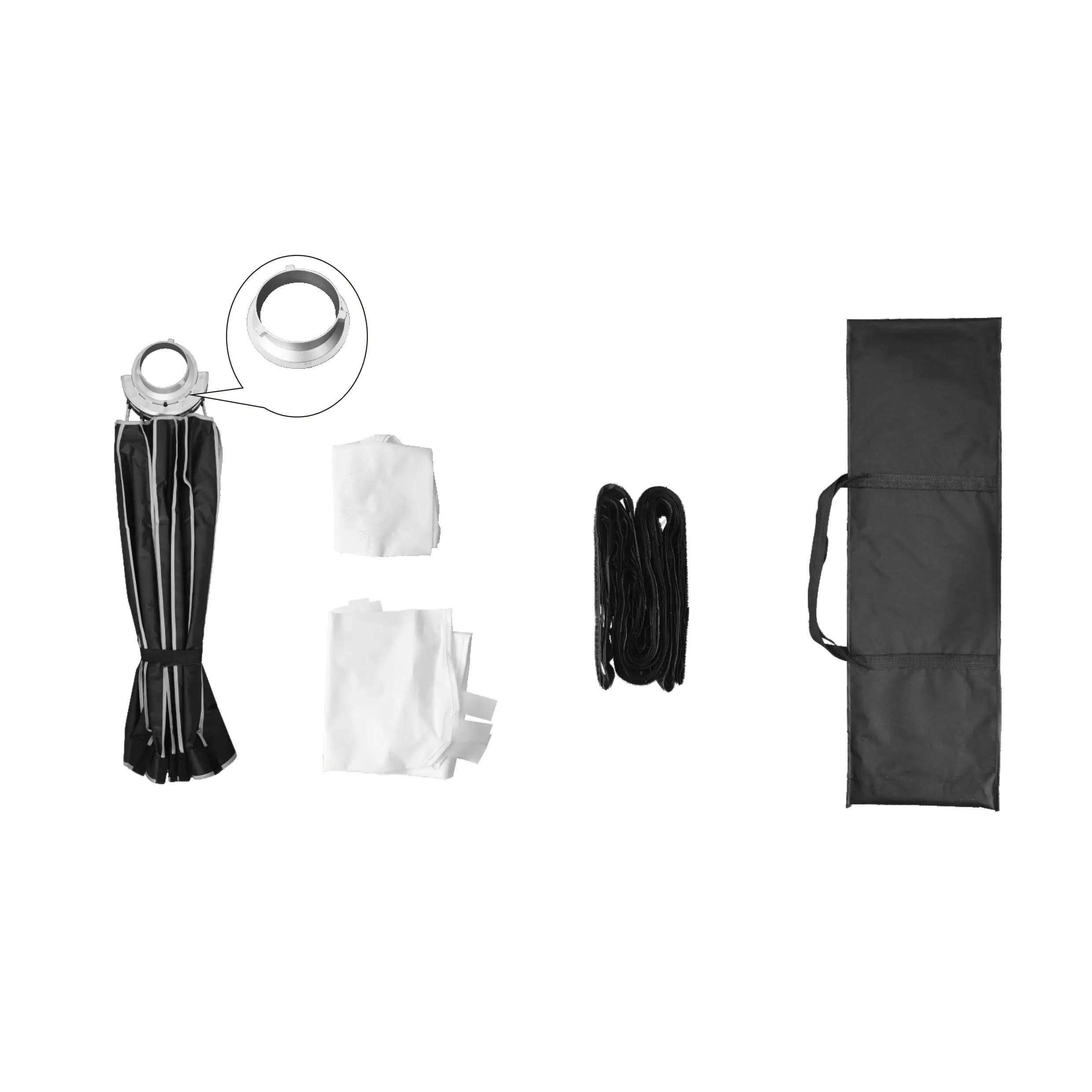 Софтбокс складывается до длины 84 см (с установленным байонетным кольцом). В комплекте плотный чехол с ручками для переноски, защищающий софтбокс от загрязнений при хранении и транспортировке.