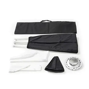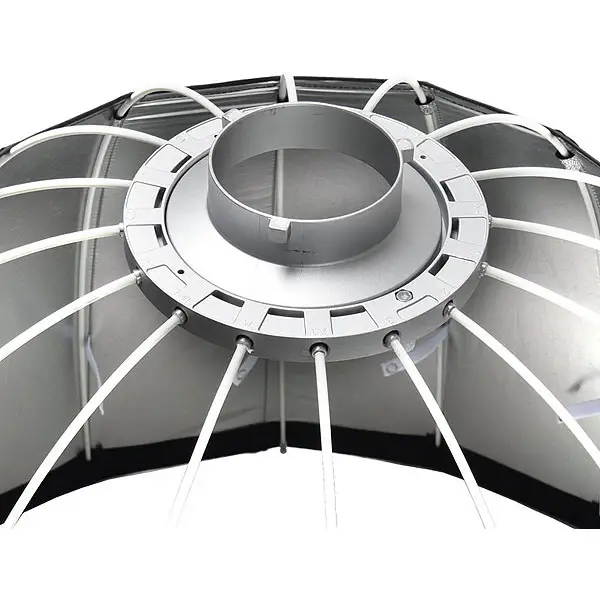 Глубокий параболический разборный тканевый софтбокс с байонетом Bowens, жаростойкое исполнение для мощных светильников. Внутреннее отражающее покрытие серебристое.