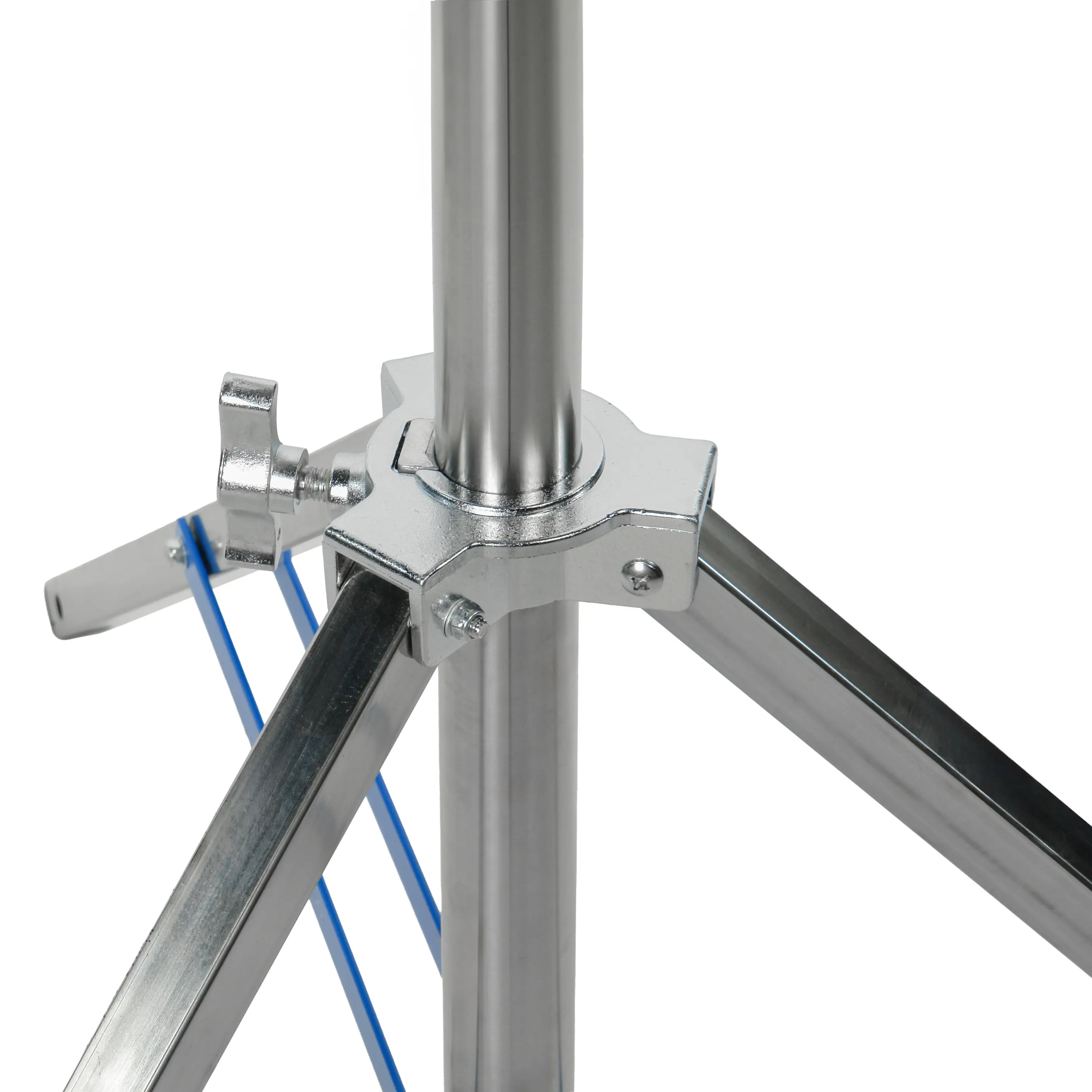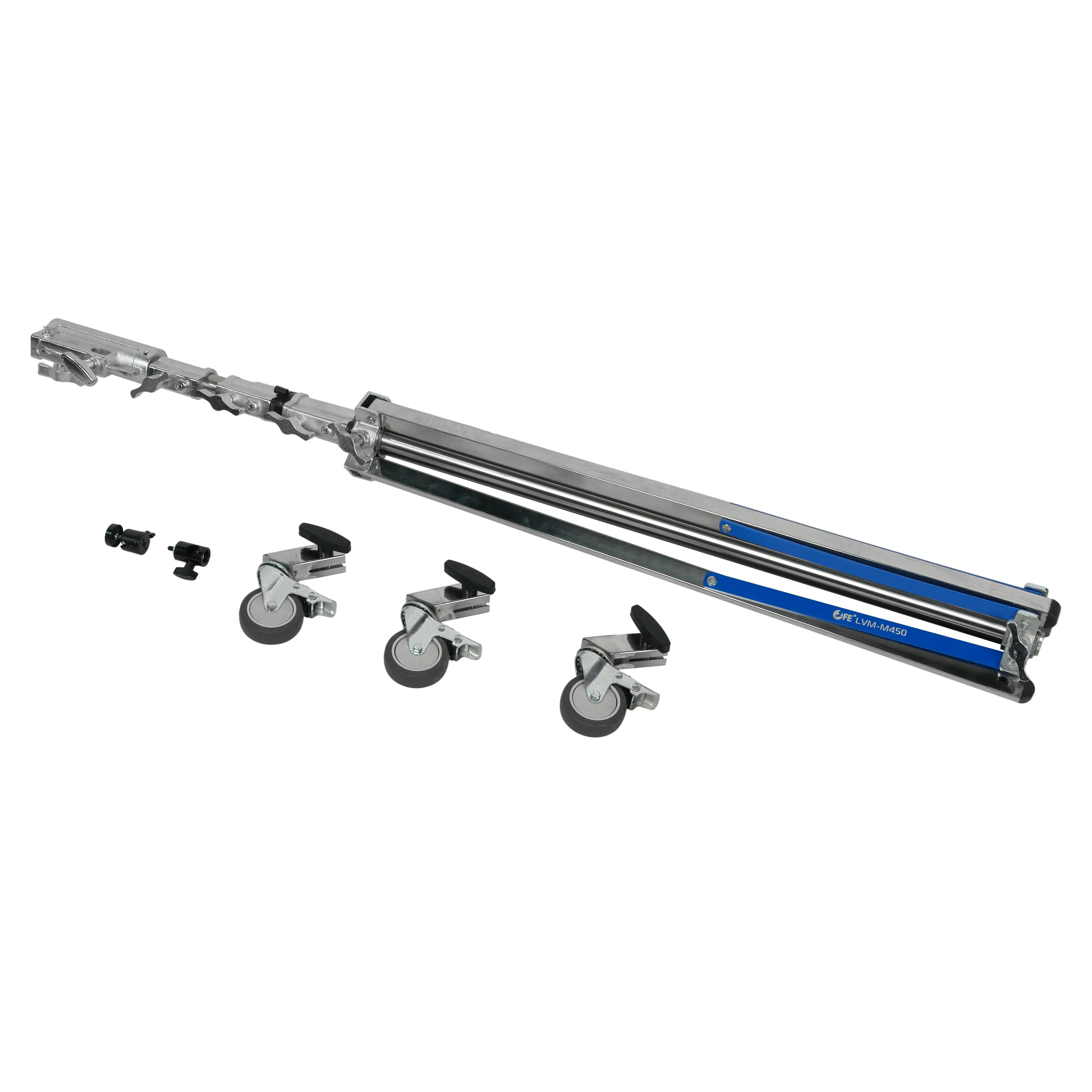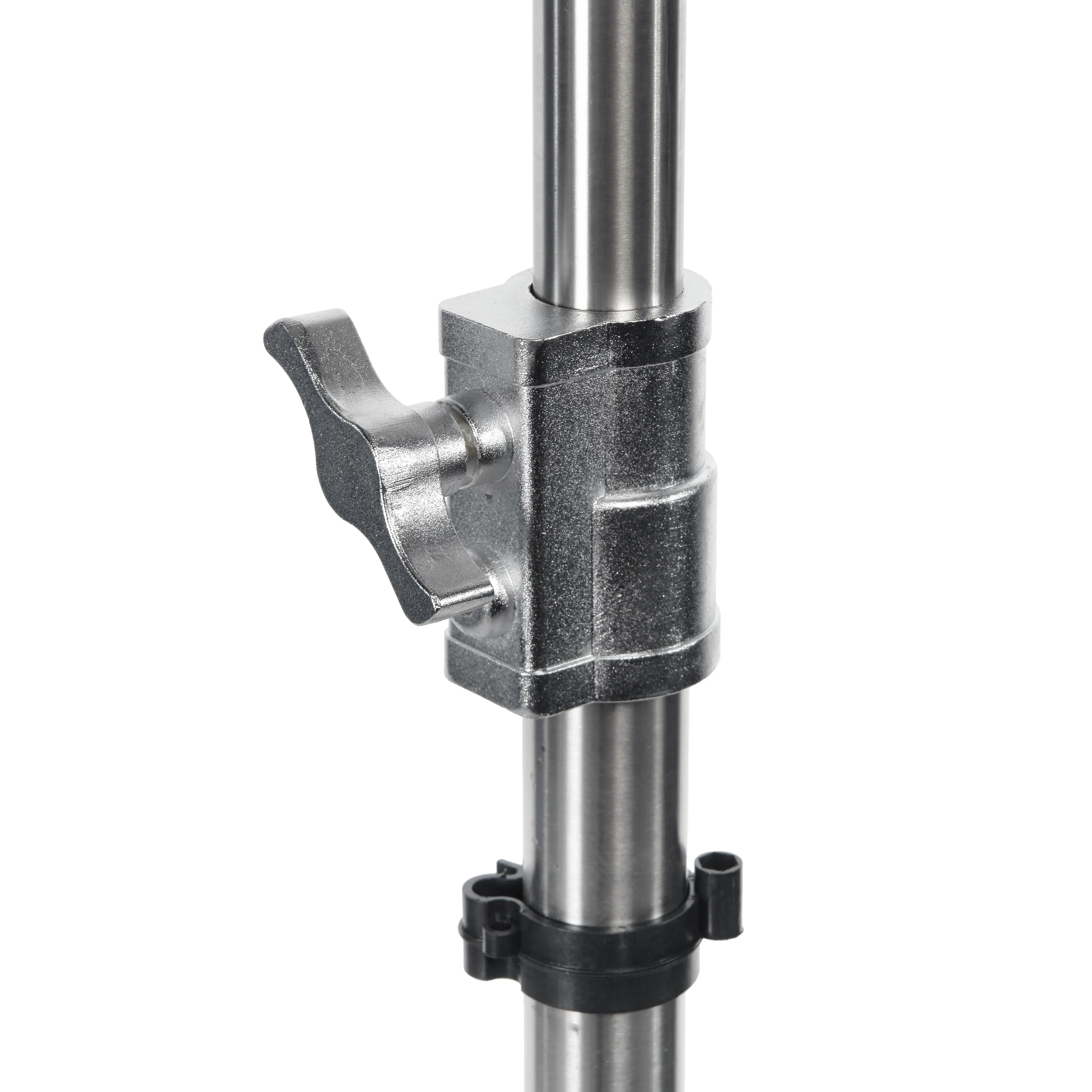 Стойка изготовлена из цельной стали, что гарантирует жесткость и устойчивость при полной нагрузке. Телескопическая четырехсекционная колонна на треноге достигает максимальной высоты 450 см. Большой диаметр секций (40/35/30/25 мм) обеспечивает оптимальную жесткость и распределение нагрузки, минимизируя раскачивание. Каждая секция надежно фиксируется усиленными винтовыми зажимами.