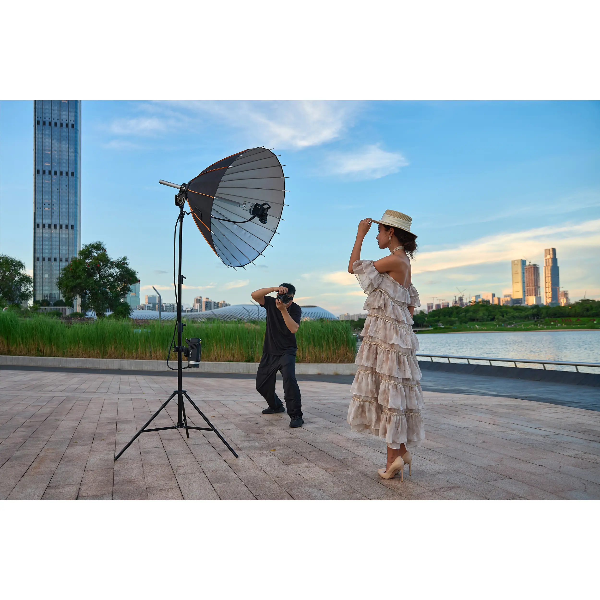 - Светодиодная моделирующая лампа мощностью 30Вт, с изменяемой цветовой температурой 2800К-6000К, для использования в качестве источника постоянного света при съемке видео.