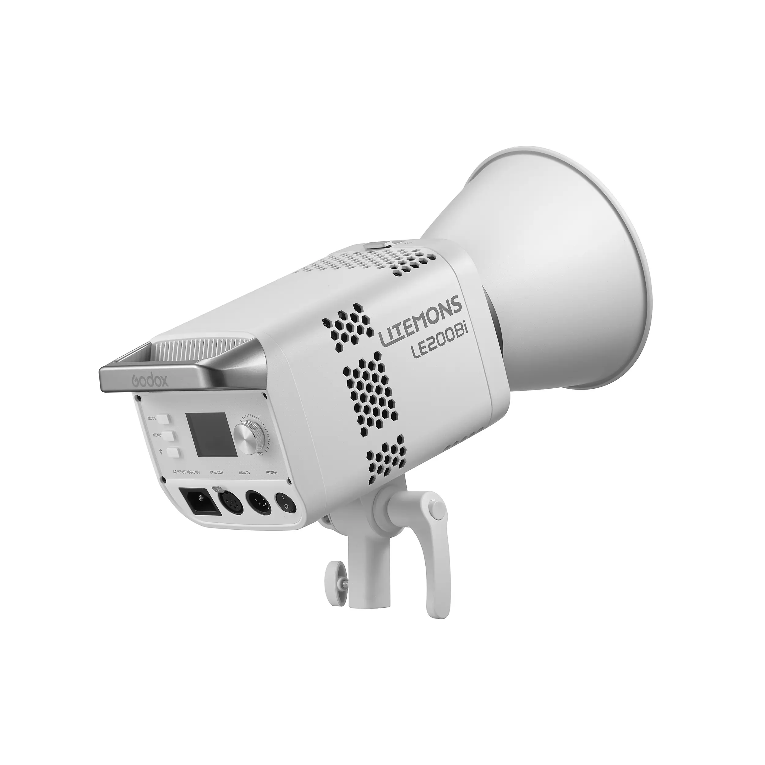 Godox LITEMONS LE200Bi — это биколорный светодиодный осветитель мощностью 220 Вт с питанием от сети 100-240 В. Прибор характеризуется высоким световым потоком, регулируемой цветовой температурой от 2800K до 6500K и исключительными индексами цветопередачи (CRI/TLCI ≥98). Оснащен встроенным блоком питания, интеллектуальной системой охлаждения и байонетом Bowens для установки светоформирующих насадок. Управление возможно как с панели на корпусе, так и дистанционно через Bluetooth, DMX512 или CRMX (опция).