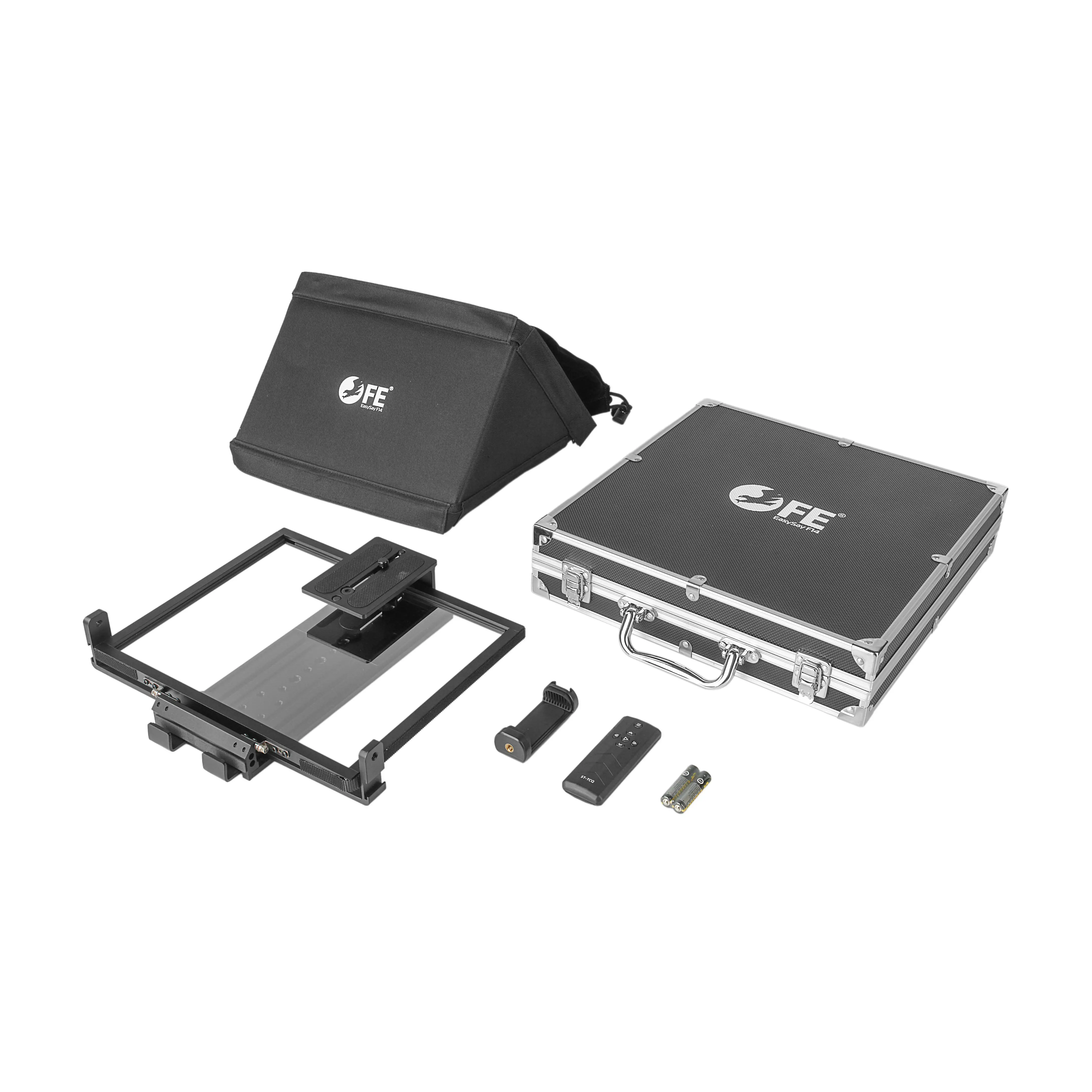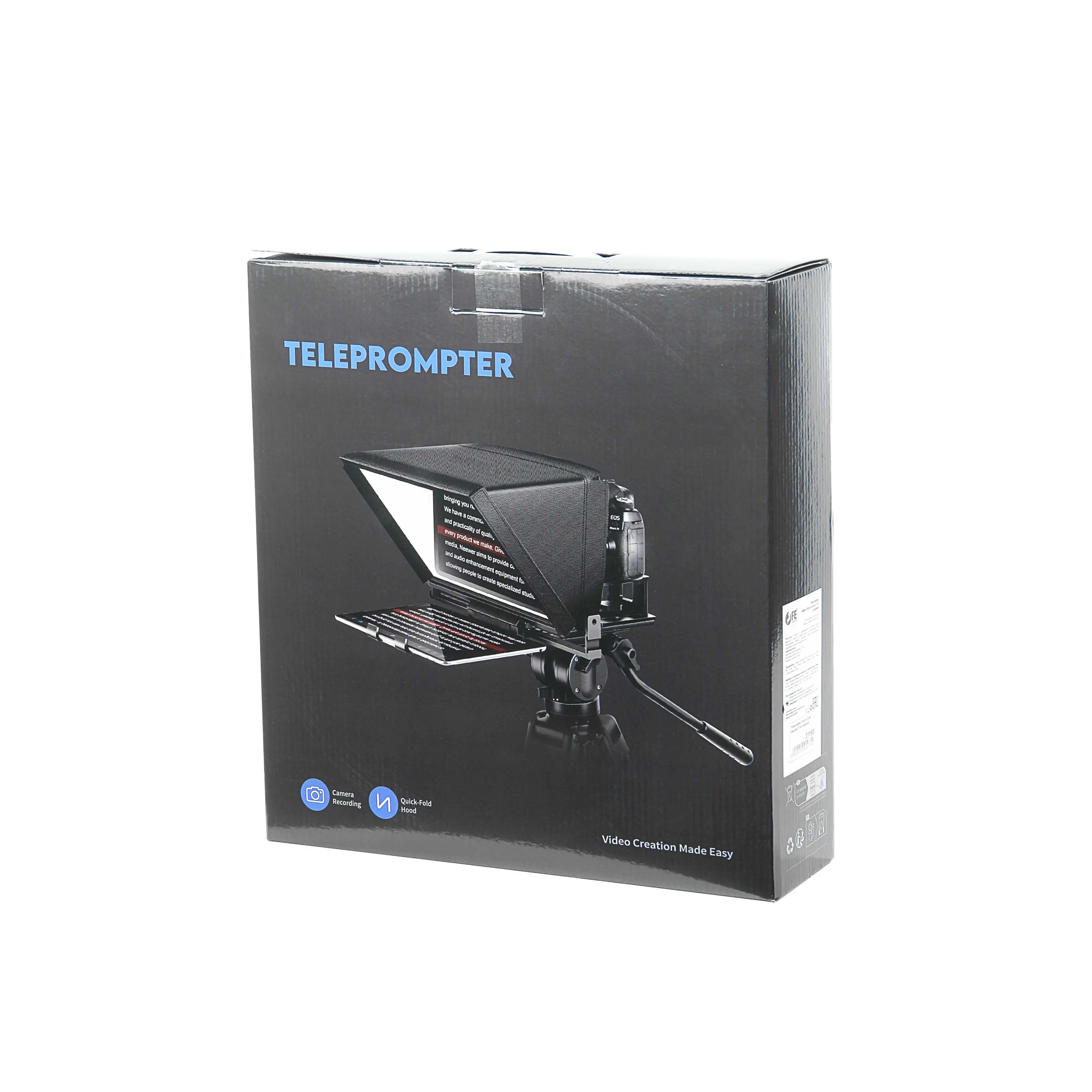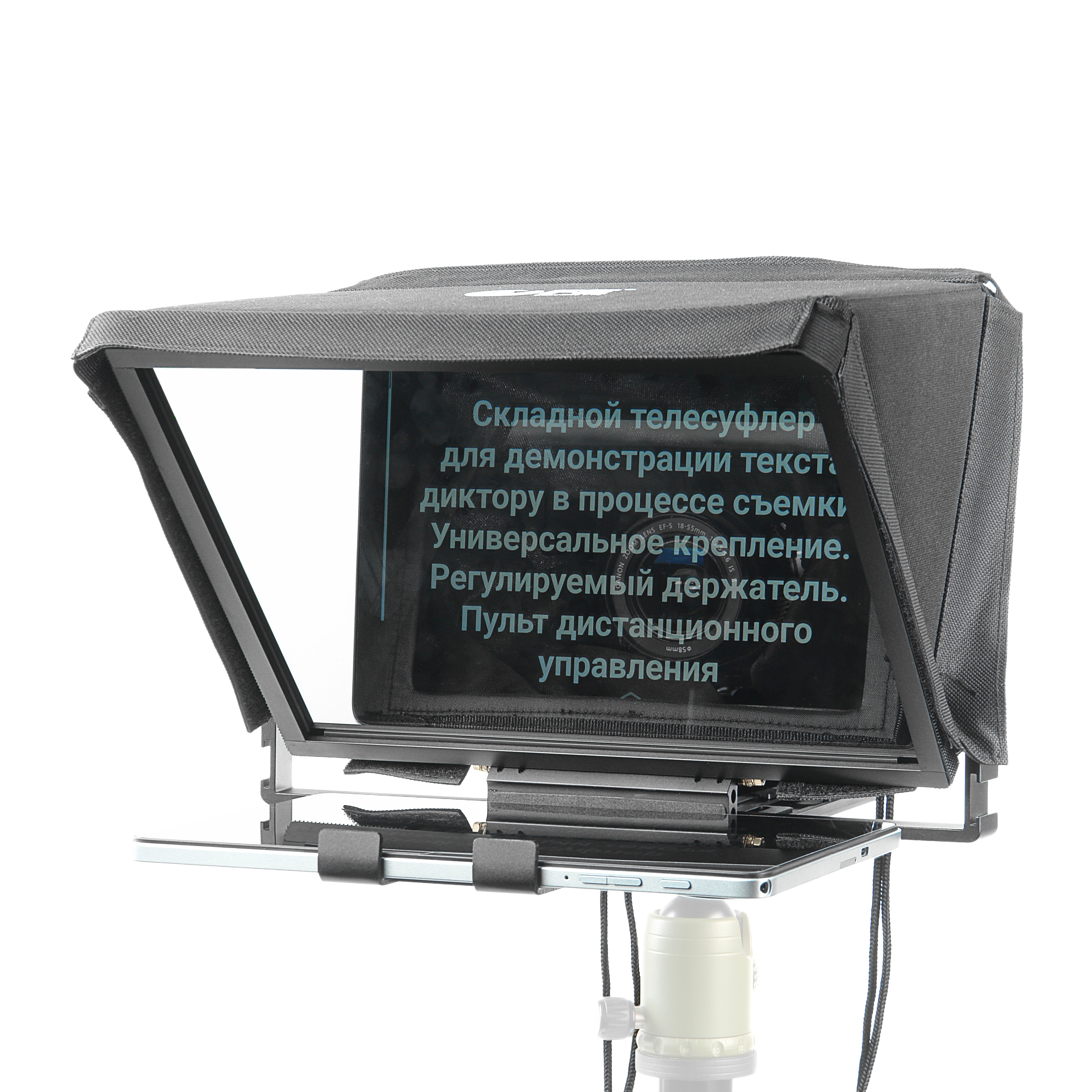 Складной телесуфлёр упакован в прочный кейс, который защищает оборудование от повреждений и делает его удобным для переноски. Телепромптер отлично подойдет для работы в небольшой видеостудии или на выездных съемках.